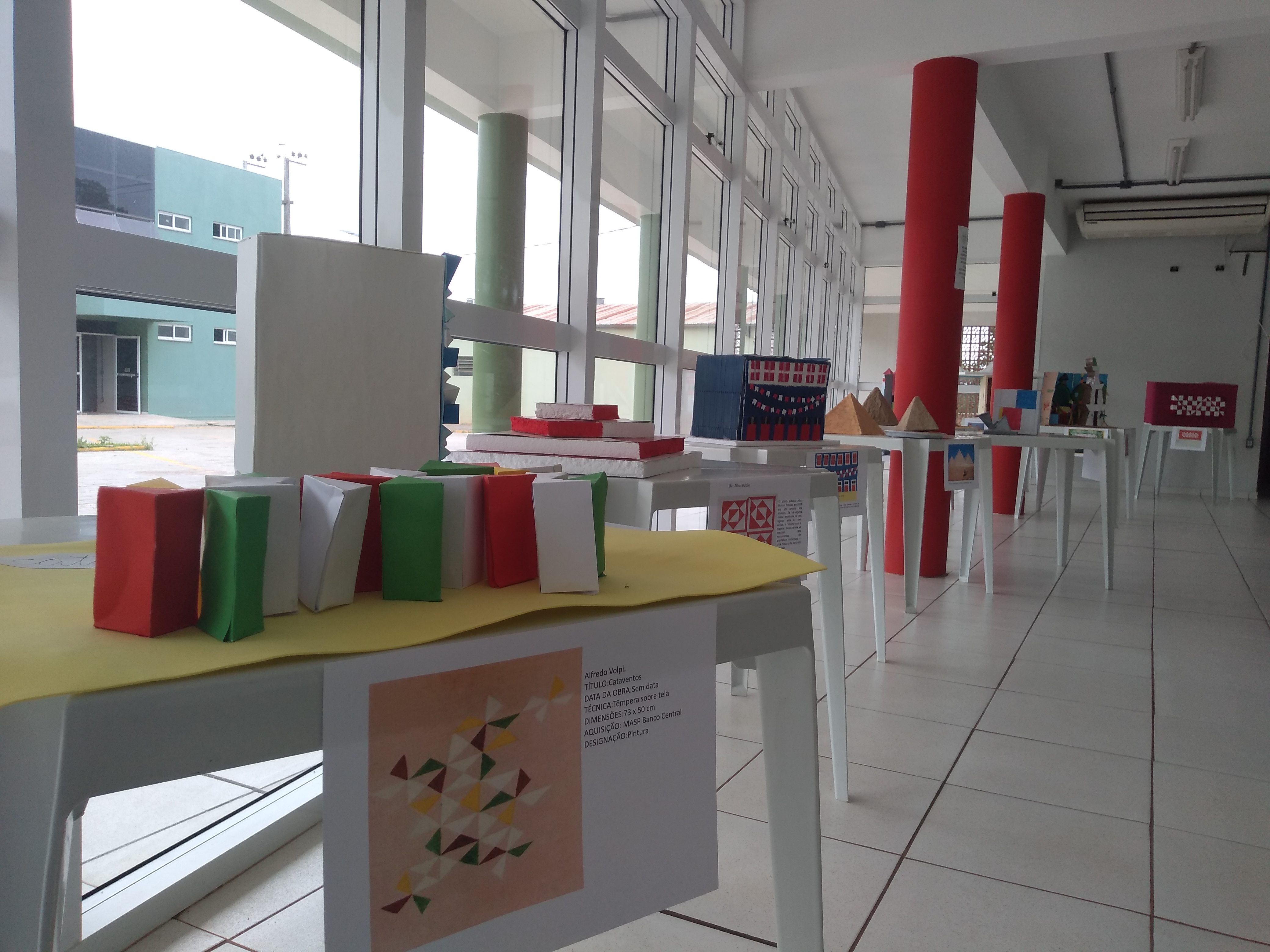 A atividade foi realizada nas aulas de arte e matemática, pelos professores Michele Moraes Lopes (artes), Mara Rúbia Couto e Elisangela Schons (Matemática) e pelos acadêmicos do Curso de Licenciatura em Matemática Amanda e Matheus com o intuito de perceber nas obras de arte as figuras geométricas. E, a partir desse olhar, realizar, em grupo ,uma proposta tridimensional dessas obras de arte realizando os cálculos necessários dos triângulos, losangos etc.