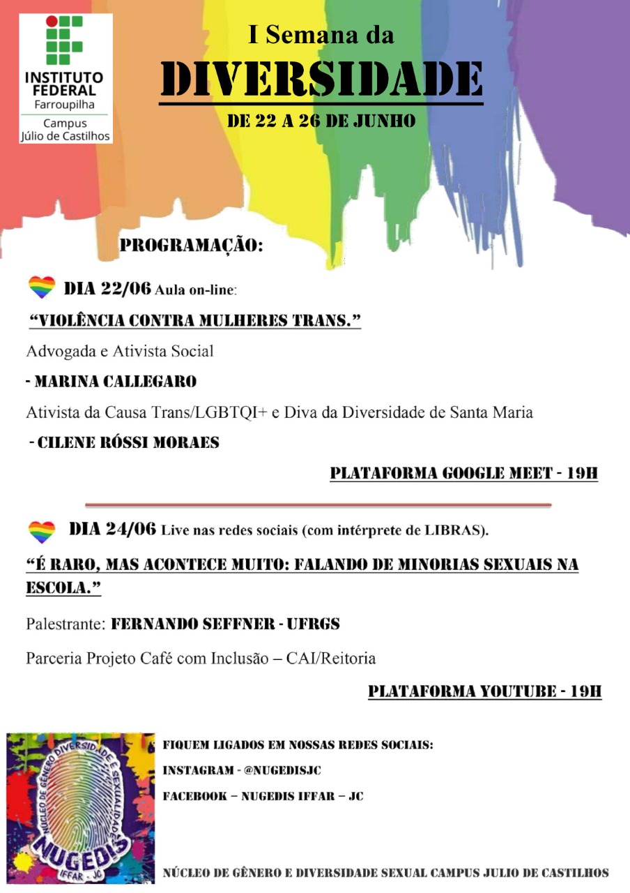 A semana de 22 a 26 de junho está repleta de atividades extracurriculares para os estudantes do Iffar Campus Júlio de Castilhos. No programa temos a I Semana da Diversidade promovida pelo NUGÉDIS, lives, seminários, palestras, além, das revisões orientadas e defesa de Trabalhos de Conclusão de Curso de estudantes da Administração.