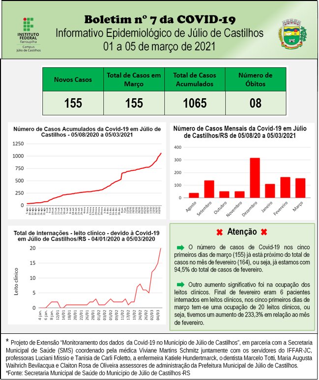 O Instituto Federal Farroupilha Campus Júlio de Castilhos (IFFAR-JC), por meio do Projeto de Extensão “Monitoramento dos dados da Covid-19 no município de Júlio de Castilhos", em parceria com a Secretaria Municipal de Saúde (SMS) apresenta os dados sobre a infecção pelo novo coronavírus no município no 7º Relatório Epidemiológico.