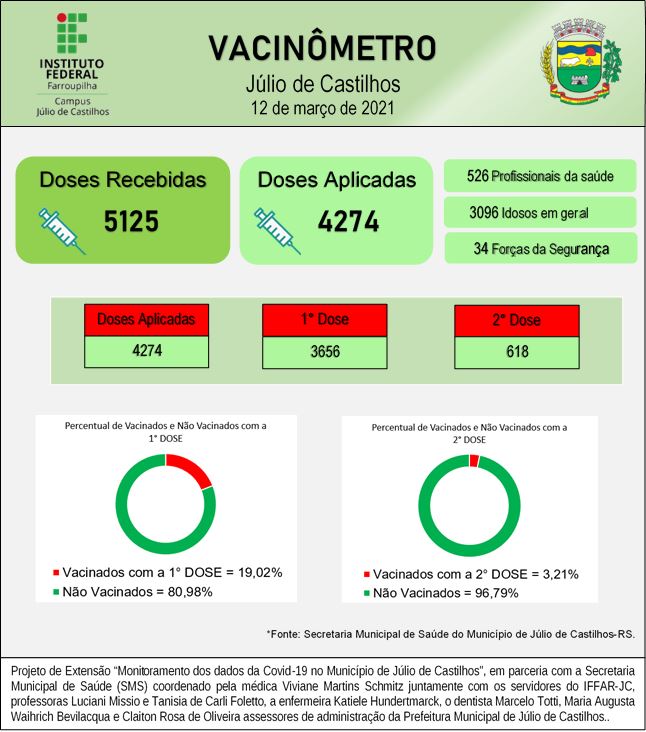 O Instituto Federal Farroupilha Campus Júlio de Castilhos (IFFar-JC), por meio do Projeto de Extensão “Monitoramento dos dados da Covid-19 no município de Júlio de Castilhos", em parceria com a Secretaria Municipal de Saúde (SMS) apresenta os dados sobre a infecção pelo novo coronavírus no município no 11º Relatório Epidemiológico. Este conta com o "Vacinômetro", que destaca o acompanhamento da vacinação contra a Covid-19 em Júlio de Castilhos.