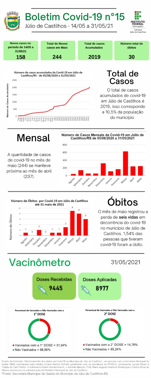 O Instituto Federal Farroupilha Campus Júlio de Castilhos (IFFar-JC), por meio do Projeto de Extensão “Monitoramento dos dados da Covid-19 no município de Júlio de Castilhos", em parceria com a Secretaria Municipal de Saúde (SMS) apresenta os dados sobre a infecção pelo novo coronavírus no município no 15º Relatório Epidemiológico. Este conta com o "Vacinômetro", que destaca o acompanhamento da vacinação contra a Covid-19 em Júlio de Castilhos.