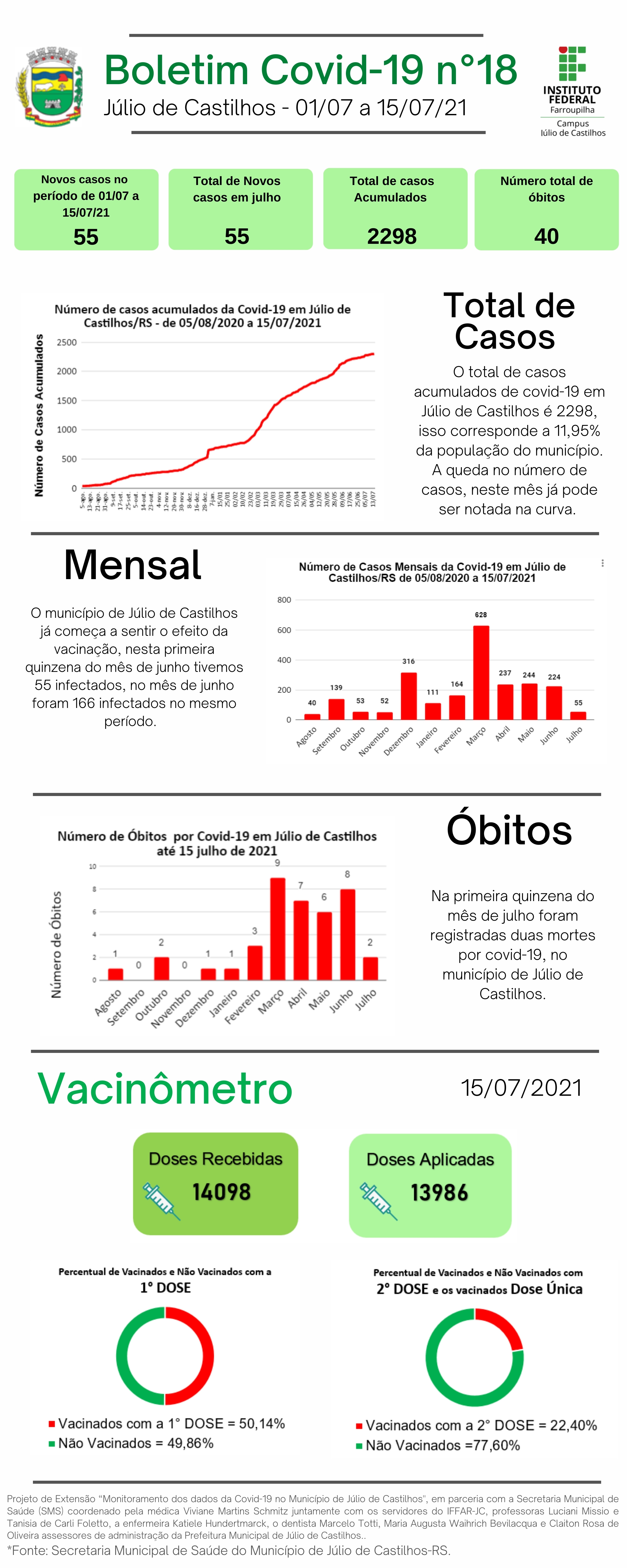 O Instituto Federal Farroupilha Campus Júlio de Castilhos (IFFar-JC), por meio do Projeto de Extensão “Monitoramento dos dados da Covid-19 no município de Júlio de Castilhos", em parceria com a Secretaria Municipal de Saúde (SMS) apresenta os dados sobre a infecção pelo novo coronavírus no município no 18º Relatório Epidemiológico. Este conta com o "Vacinômetro", que destaca o acompanhamento da vacinação contra a Covid-19 em Júlio de Castilhos.