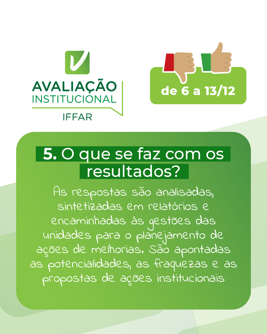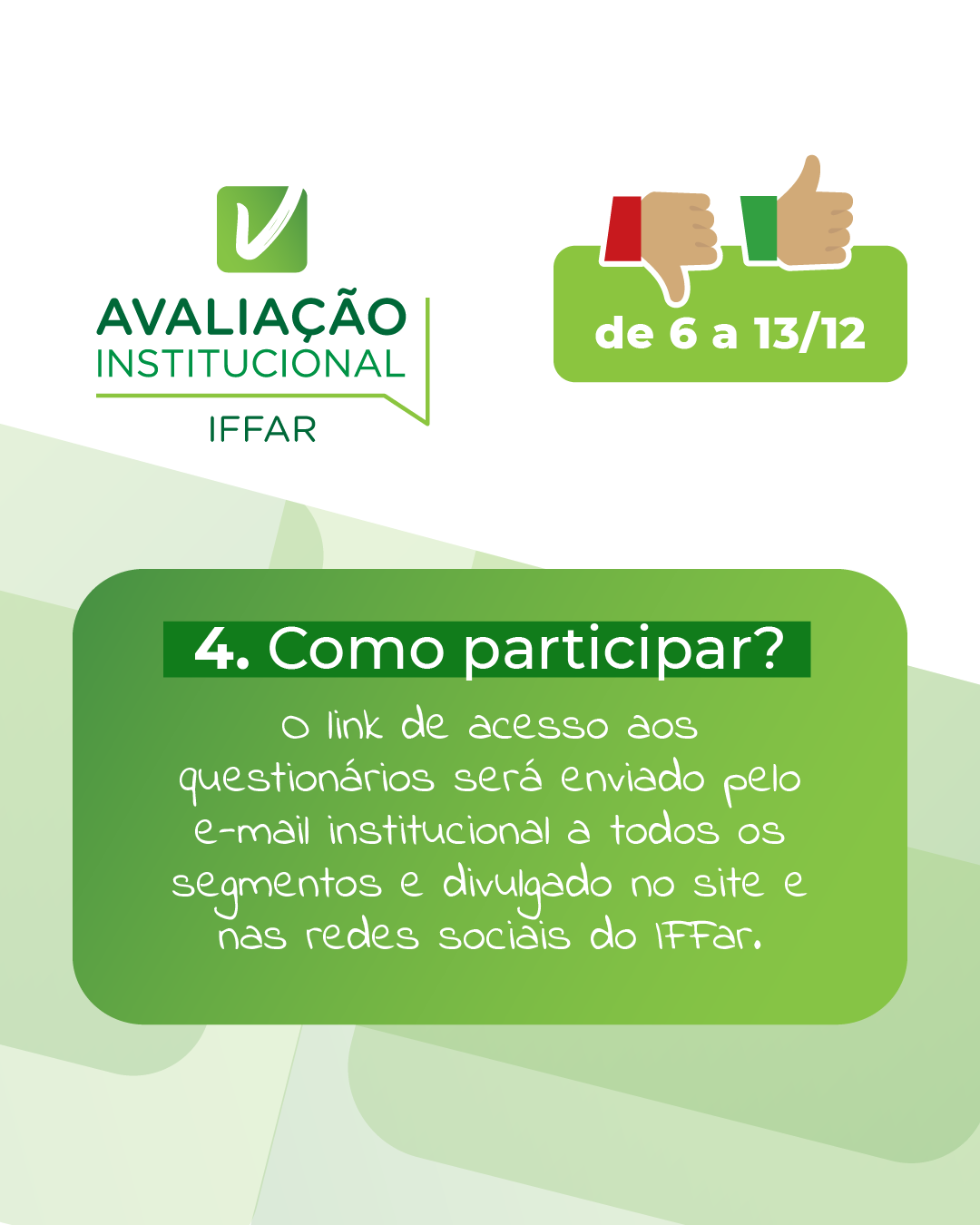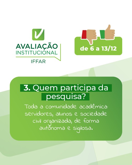 As perguntas são relativas à gestão do IFFar, às políticas para ensino, pesquisa e extensão, ao Plano de Desenvolvimento Institucional (PDI), à Assistência Estudantil, à comunicação, à participação nas avaliações, à infraestrutura, entre outros pontos.