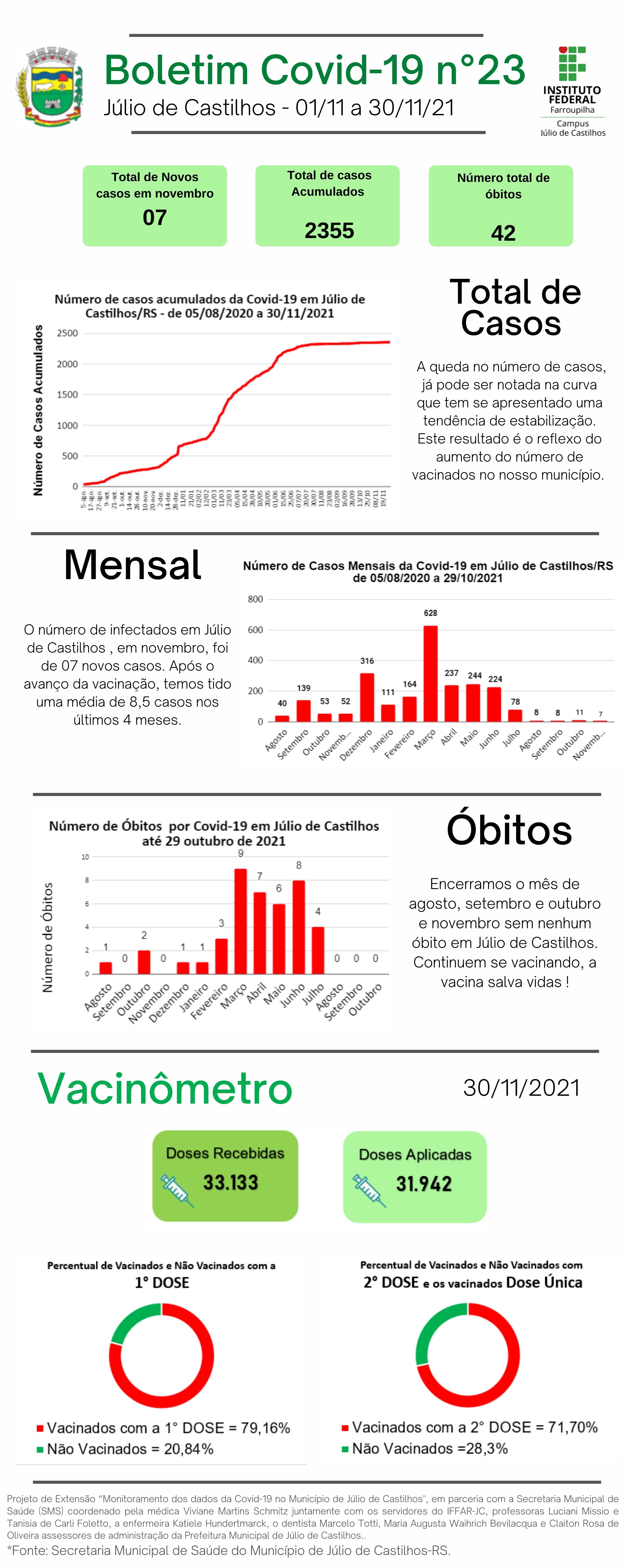 O Instituto Federal Farroupilha Campus Júlio de Castilhos (IFFar-JC), por meio do Projeto de Extensão “Monitoramento dos dados da Covid-19 no município de Júlio de Castilhos", em parceria com a Secretaria Municipal de Saúde (SMS) apresenta os dados sobre a infecção pelo novo coronavírus no município no 23º Relatório Epidemiológico. Este conta com o "Vacinômetro", que destaca o acompanhamento da vacinação contra a Covid-19 em Júlio de Castilhos. O projeto tem como objetivo monitorar a evolução dos dados relacionados a Pandemia da Covid-19 no município de Júlio de Castilhos, criando um fluxo de dados que facilite a interpretação das informações à toda comunidade castilhense, favorecendo a conscientização e como consequência a prevenção à doença, compilando os dados de forma a contribuir para o planejamento de políticas de saúde pública.