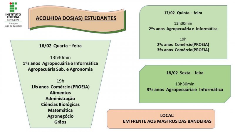 No Campus Júlio de Castilhos, o retorno dos(as) estudantes será de forma escalonada, acolhendo calouros e veteranos em dias diferentes. O formato escalonado vai permitir que as turmas sejam recebidas nos seus primeiros dias de maneira mais tranquila e segura. Veja nos anexos abaixo, os cronogramas semanais, contendo a organização dessa escala.