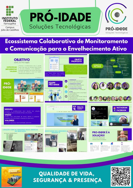 Um dos objetivos do é monitorar o idoso através das tecnologias não invasivas (sensores), de baixo custo, para gerar o bem estar do idoso, o conforto familiar, a segurança do idoso e a comunicação com a família, cuidadores e responsáveis diretos em tempo real. O projeto de pesquisa e inovação PRÓ-ID@DE foi comtemplado com fomento através do Edital 05/2020 – Empreendedorismo Inovador, e está em andamento no Campus Júlio de Castilhos. É coordenado pela professora Thais Andrea Baldissera e tem como professores colaboradores Maria Angelica Oliveira, Paulino Tavares e Everton Horst. Envolve estudantes do curso técnico em informática, técnico em comércio e bacharelado em administração. São realizadas atividades dedicadas ao desenvolvimento de uma rede de sensores e dispositivos inteligentes que coletam informações e interagem com os clientes (familiares) para otimizar os serviços prestado aos idosos. Isso demonstra que, o PRÓ-ID@DE tem um potencial não só de monitorar, mas também de contribuir para agilizar o processo das demandas do idoso como as assistências psicológicas, sociais, médicas, hospitalares, políticas públicas, entre outras, que podem ajudar a melhorar a qualidade de vida dos idosos. O projeto está potencializando a consolidação da inserção ativa do idoso na sociedade e a participação dos amigos e familiares no dia-a-dia do idoso mesmo a distância. Vemos que é uma responsablidade da sociedade mas também nossa responsabilidade, afinal NÓS SOMOS OS IDOSOS ATIVOS DO AMANHÃ.