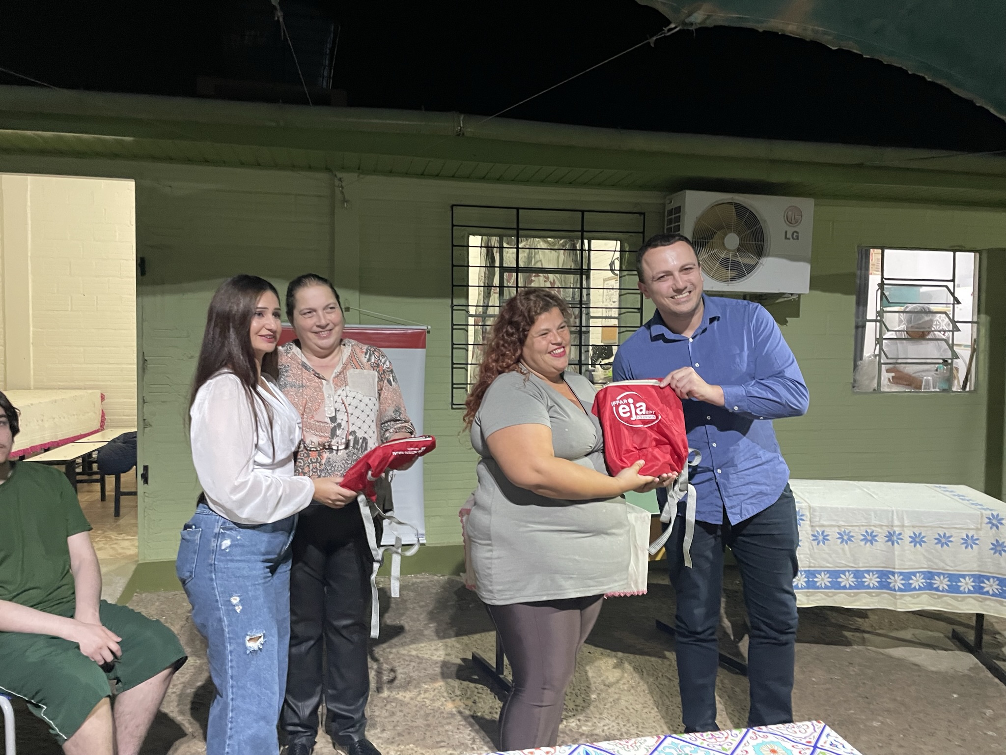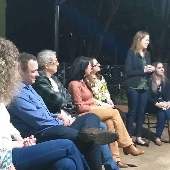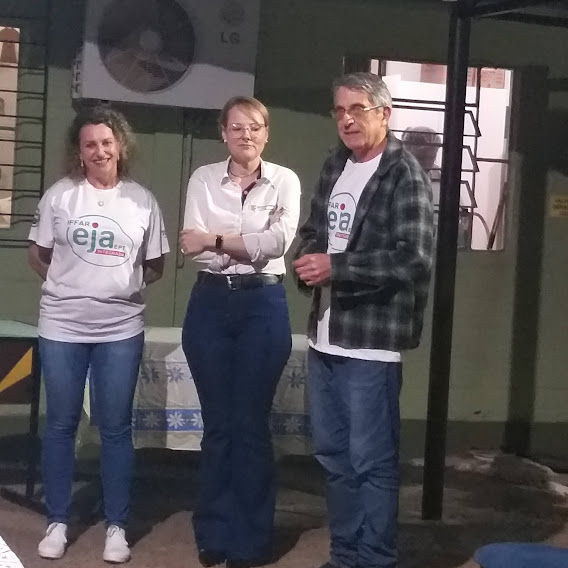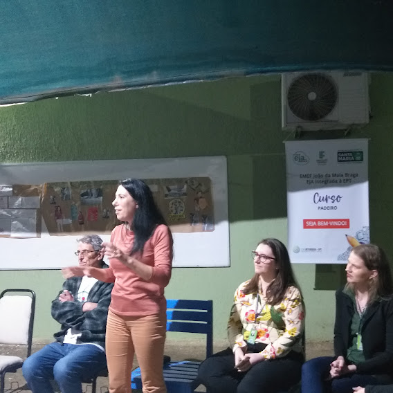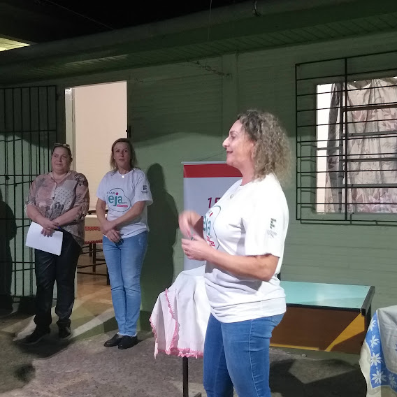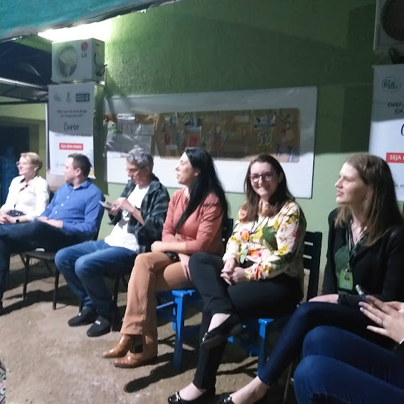 A diretora ressaltou que a escola recebe alunos/as desde a educação infantil até o ensino fundamental completo, com a modalidade EJA desde 2002. Lozecler ainda aproveitou para solicitar ao IFFar e a prefeitura que sejam disponibilizadas turmas de EJA – ensino médio na escola. Ela também apresentou os docentes da escola ligados ao curso: Lenir, Luís Tadeu, Sílvio, Fabrício e Tereza.