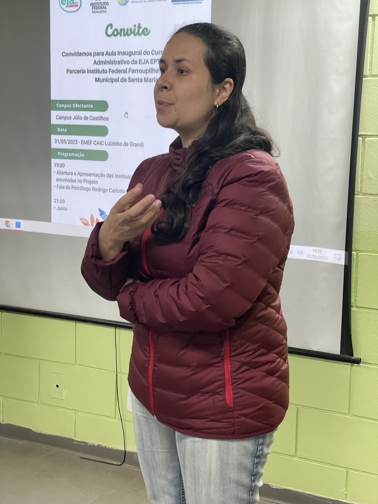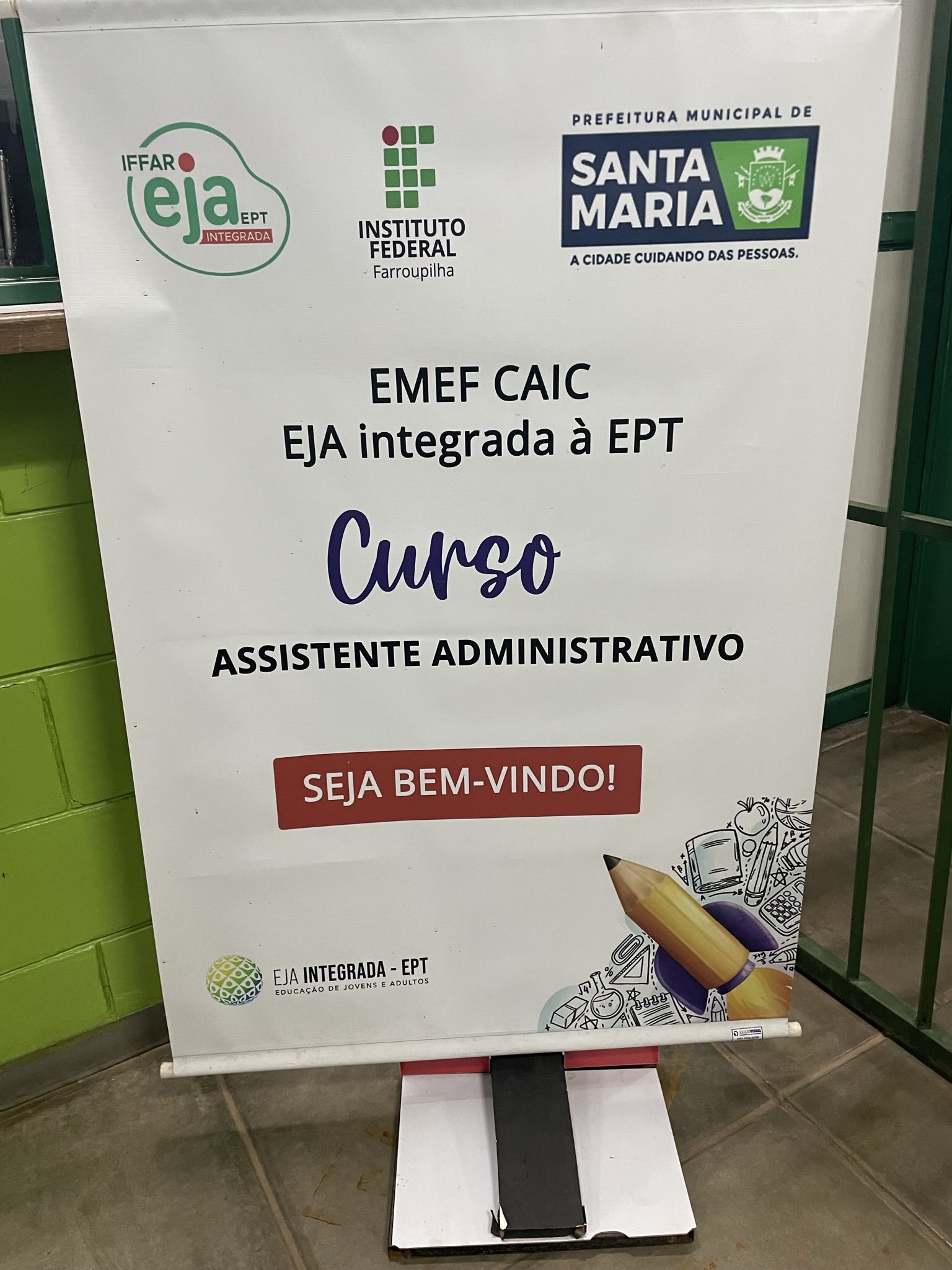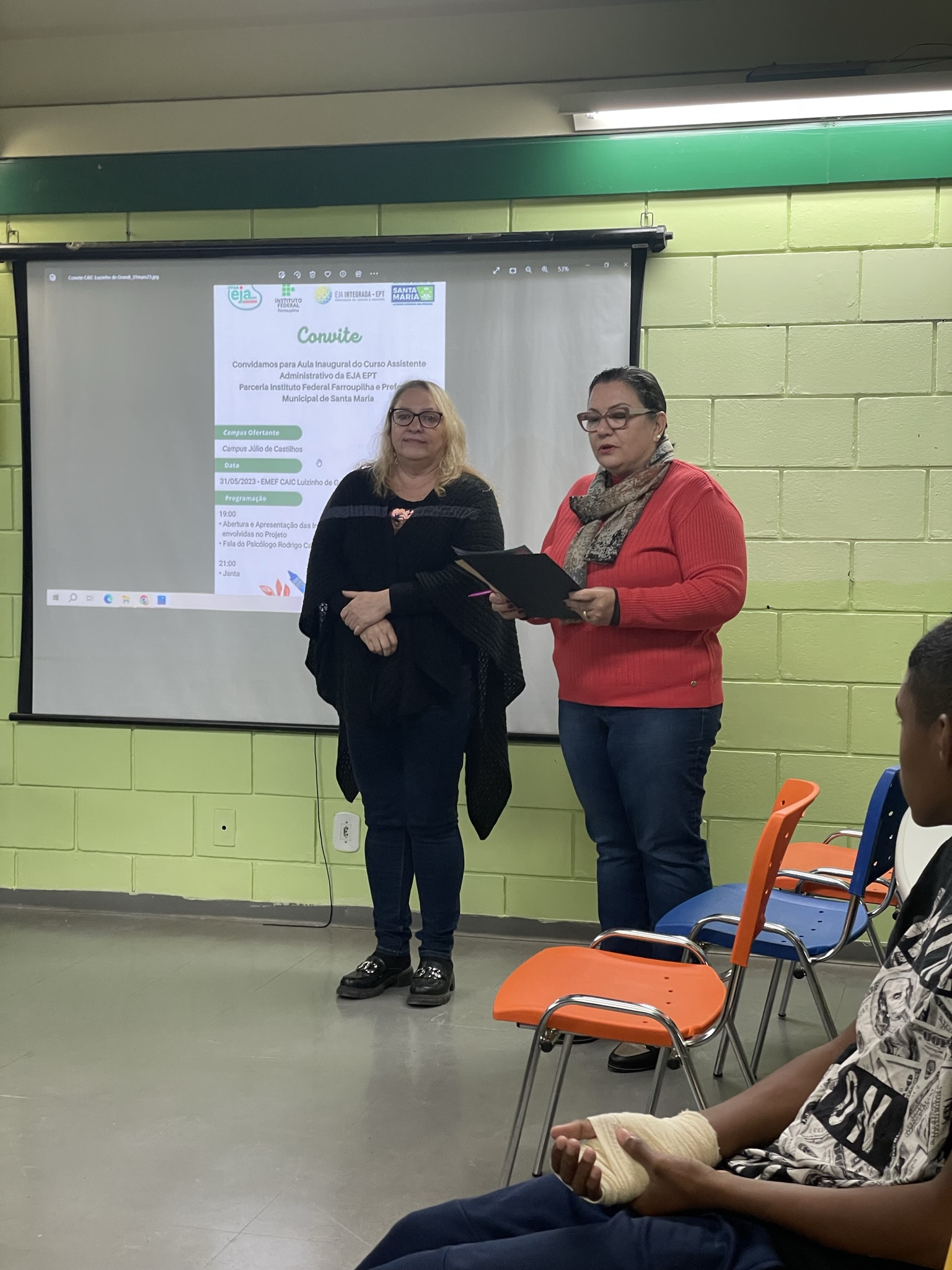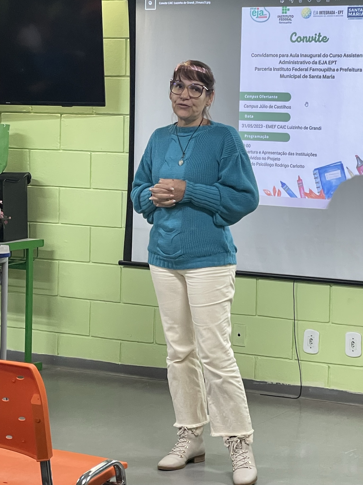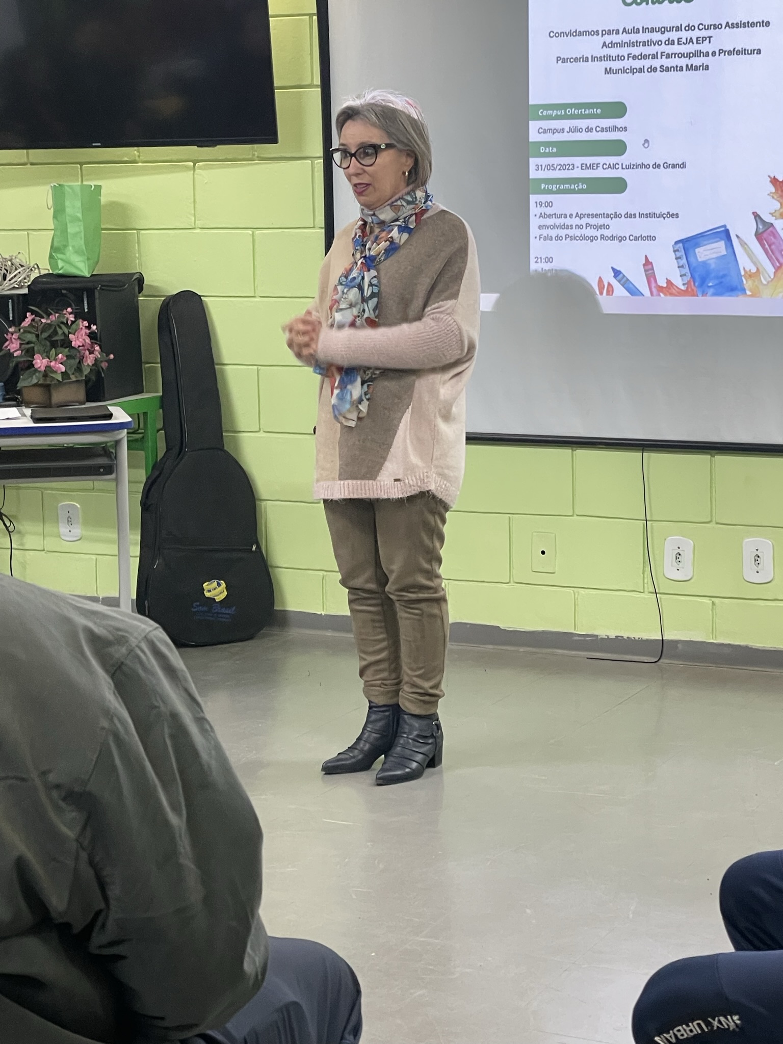 Na noite de ontem (31/05) aconteceu a Aula Inaugural do curso de Assistente Administrativo na escola Caic Luizinho de Grandi. A diretora, Maria Helena Londero Antonello falou da importância do curso e da educação de jovens (EJA) junto com um curso técnico como uma qualificação para enfrentar o mercado de trabalho e agradeceu pela parceria da prefeitura e do IFFar.