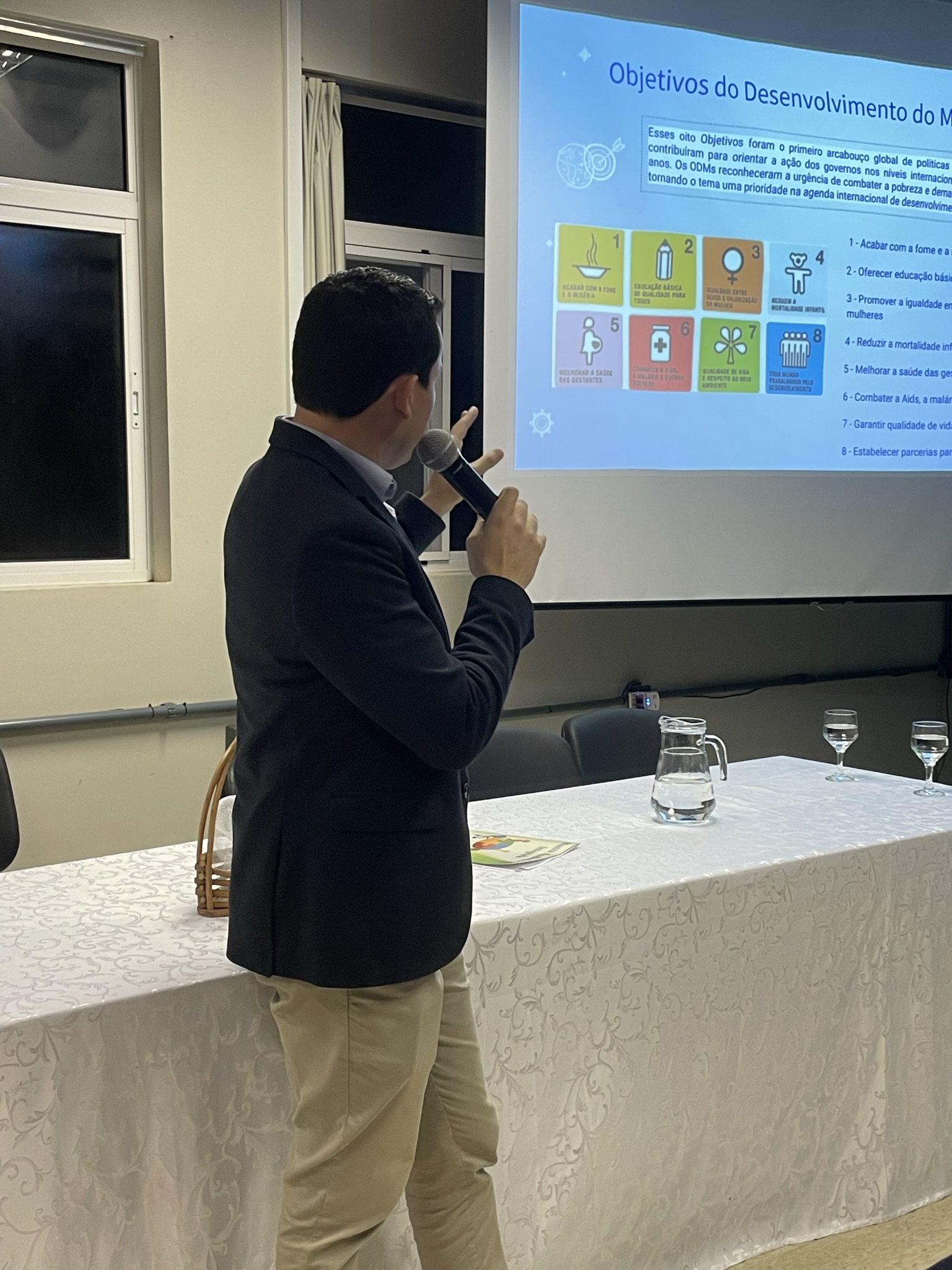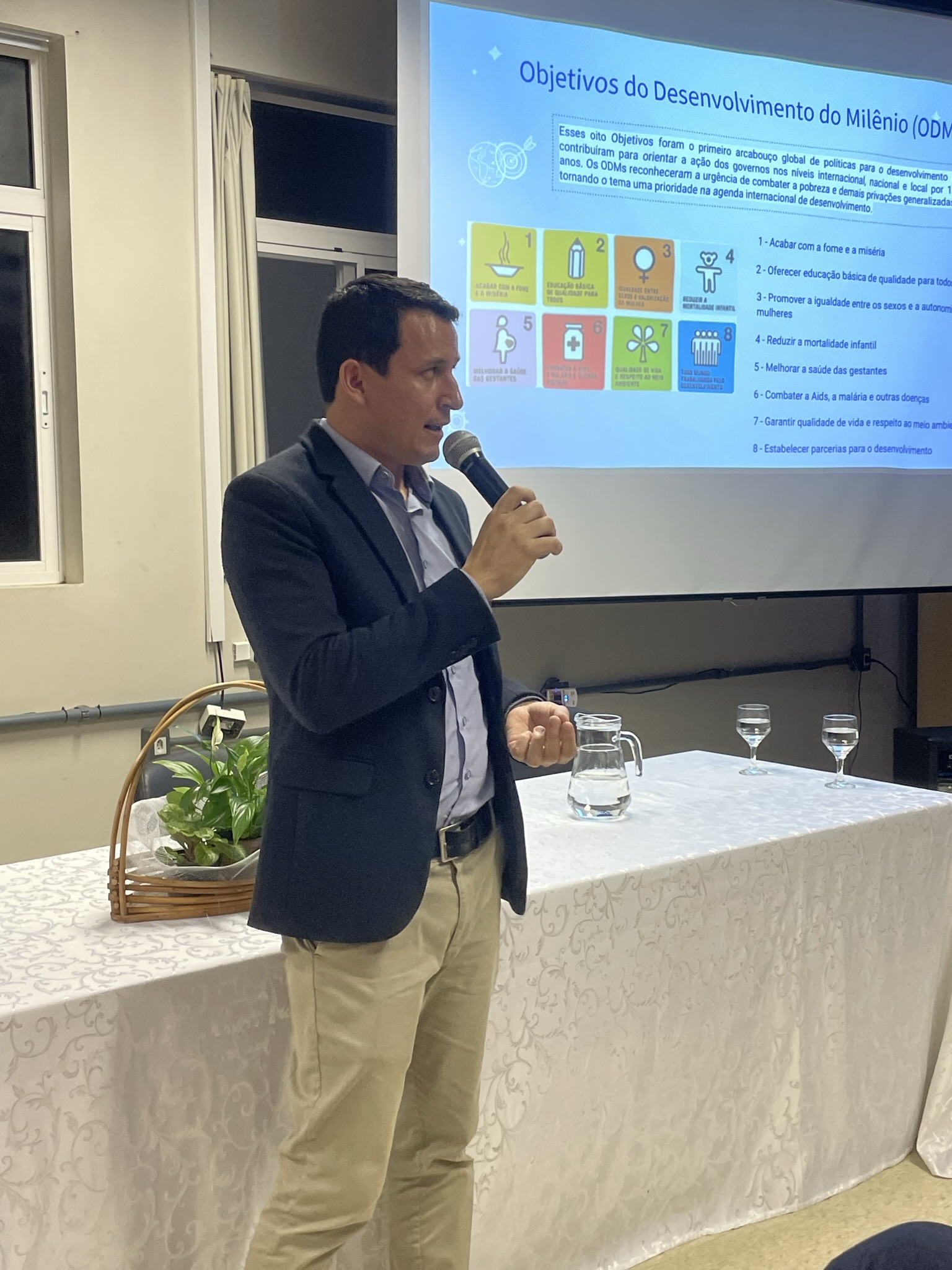 Lucas falou sobre a Agenda 2030, na qual os ODM (objetivos de desenvolvimento do milênio) que eram oito (8) foram desdobrados em ODS, que são 17. Nesse sentido, apresentou uma metodologia para integrar os ODS: