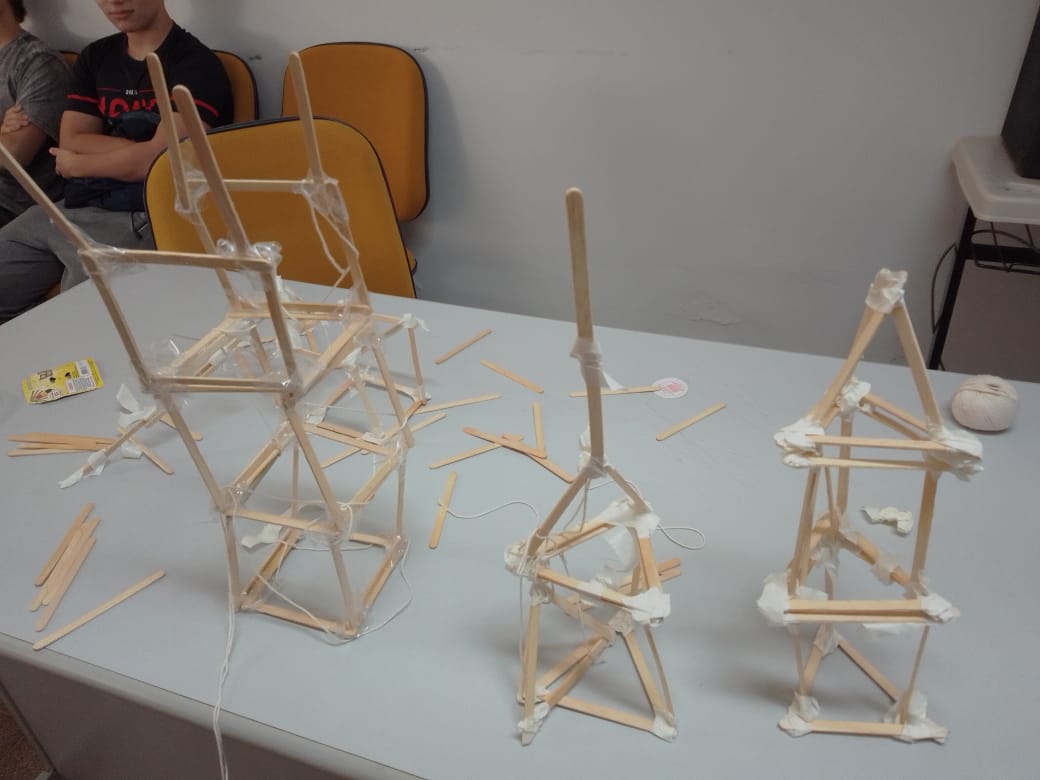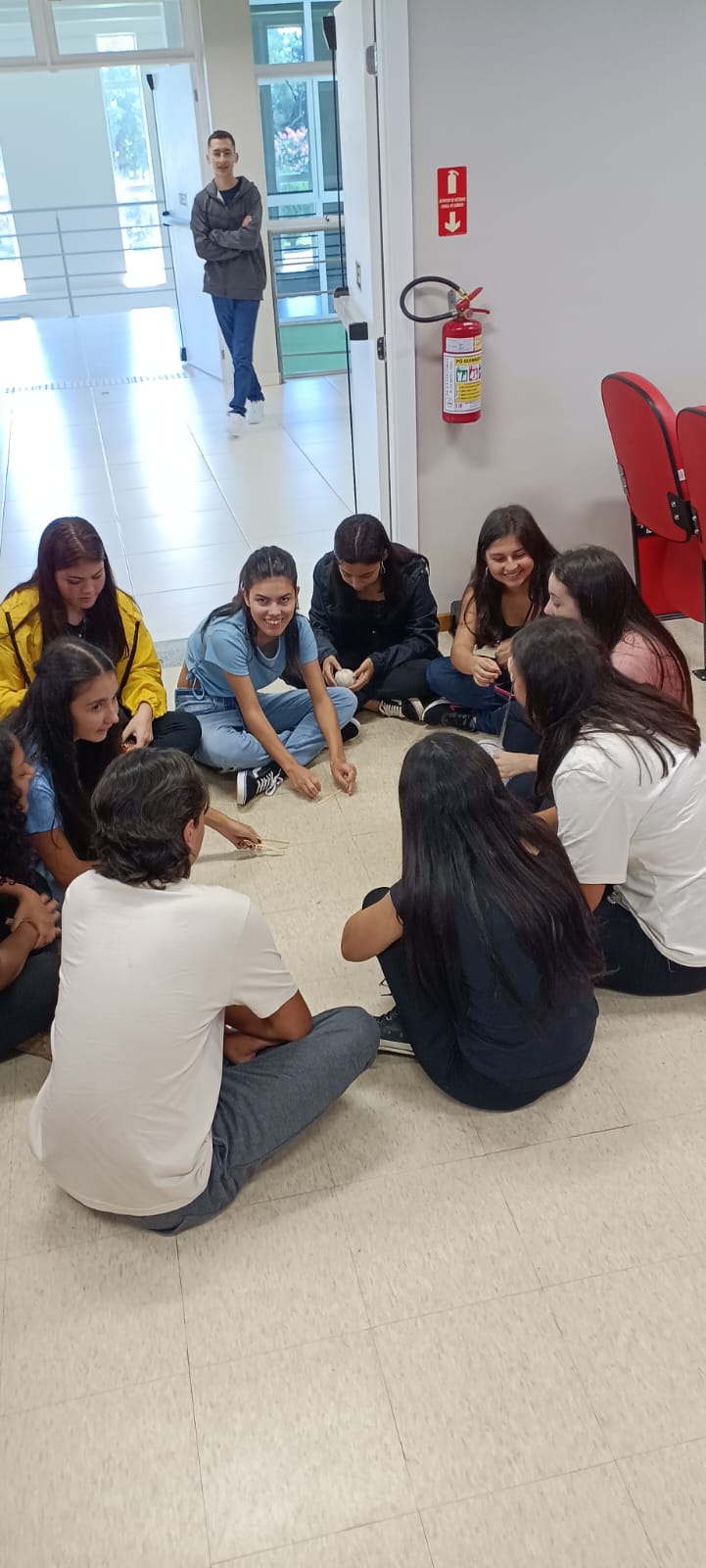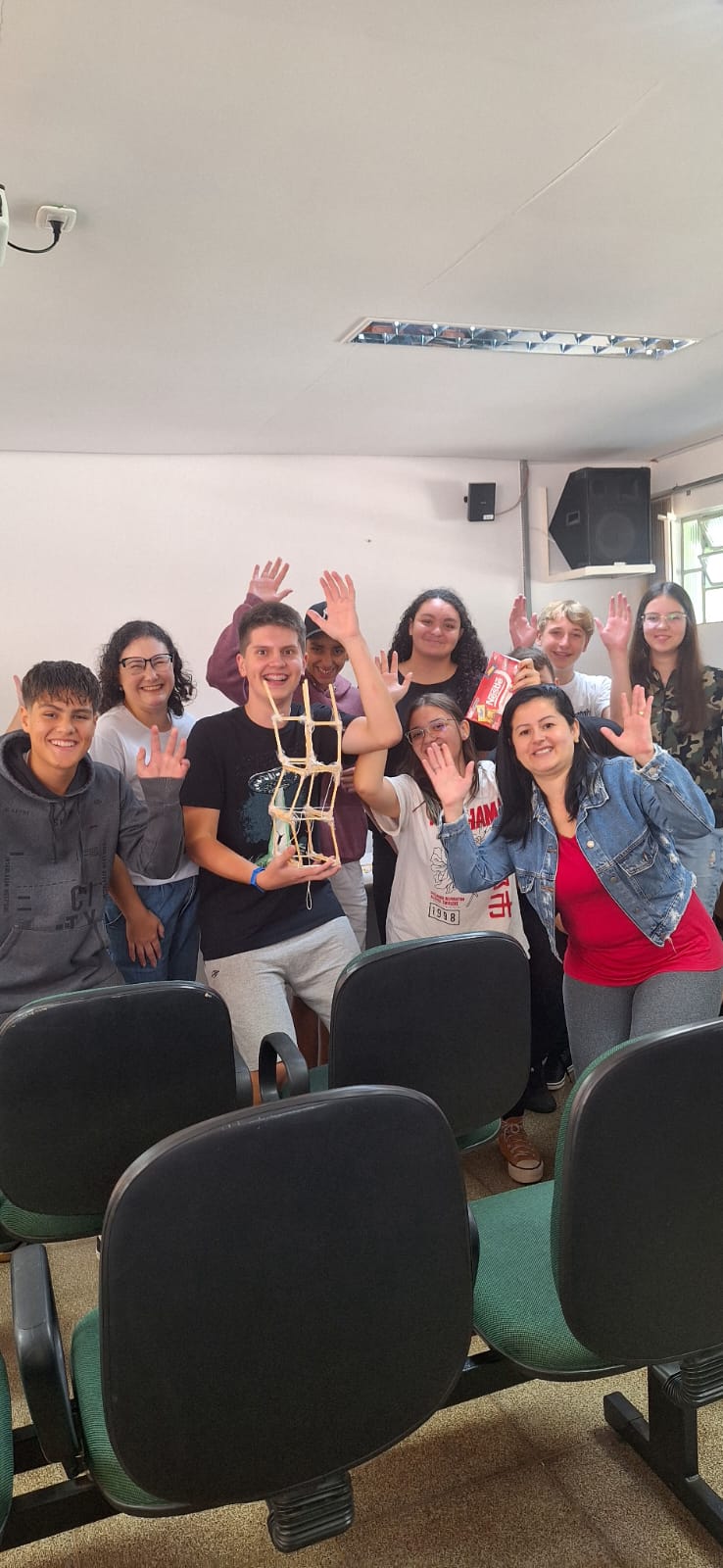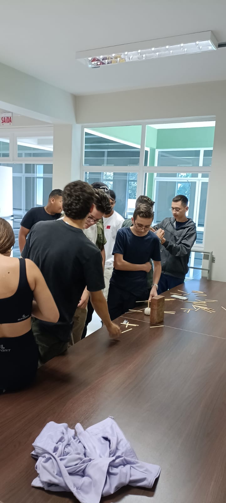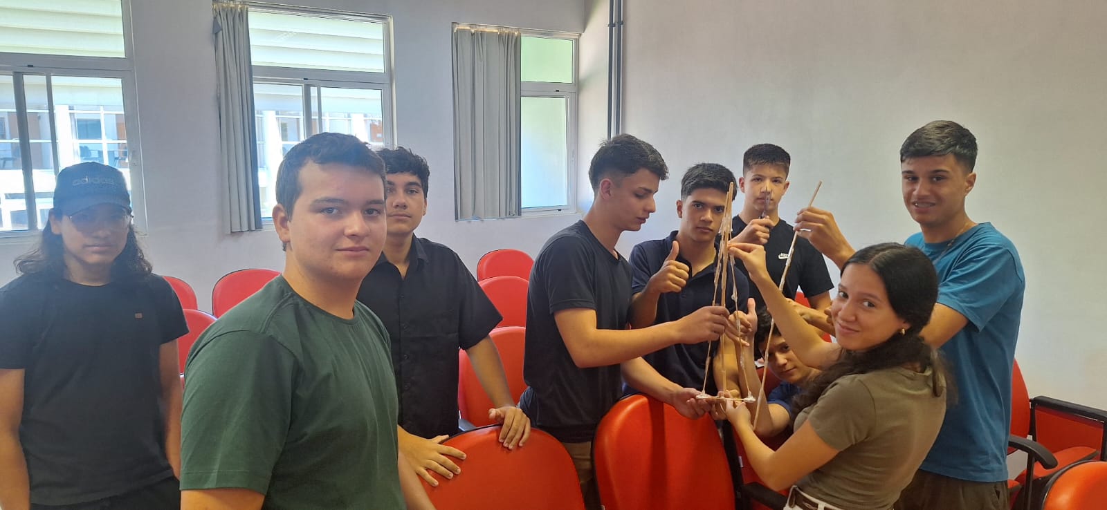 Após o momento inicial, as psicólogas Bruna Estivalet e Jaciara Janke fizeram a dinâmica da torre com os/as estudantes, com o objetivo de trazer uma integração entre os/as discentes recém-chegados/as. Os/as estudantes tiveram a experiência de trabalhar em equipe para realizar a tarefa de construção da torre e a oportunidade de conhecer os/as colegas deste ano letivo.