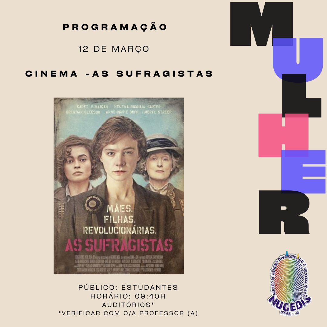 No dia 12 de março, às 9h40min, acontece a exibição do filme “As sufragistas” no Auditório do Prédio Administrativo e no Auditório do Prédio A. As turmas serão direcionadas pelos/as professores/as, para que todos/as fiquem bem acomodados/as para a atividade.