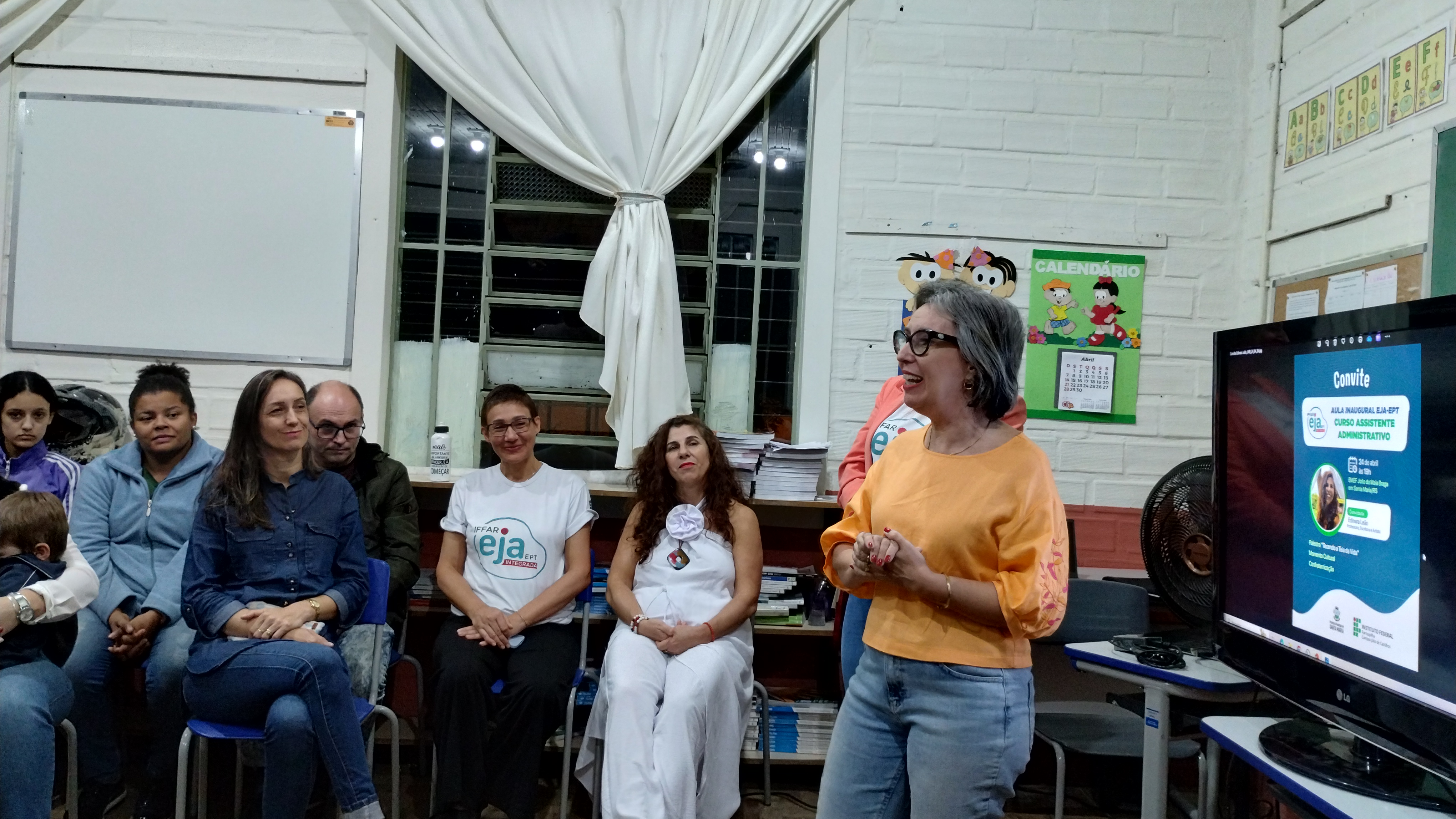 Cleia destacou estar feliz com a sala cheia e fez uma saudação especial aos/as alunos/as. Após fez um apanhado dos números da EJA no IFFar: são 11 municípios para que mais pessoas tenham um ensino de qualidade e as parcerias são essenciais. “Não desista, porque vocês estão sendo privilegiados por terem essa oportunidade de estudo, já que são 60 milhões de brasileiros/as que não concluíram o ensino médio”, disse a professora.