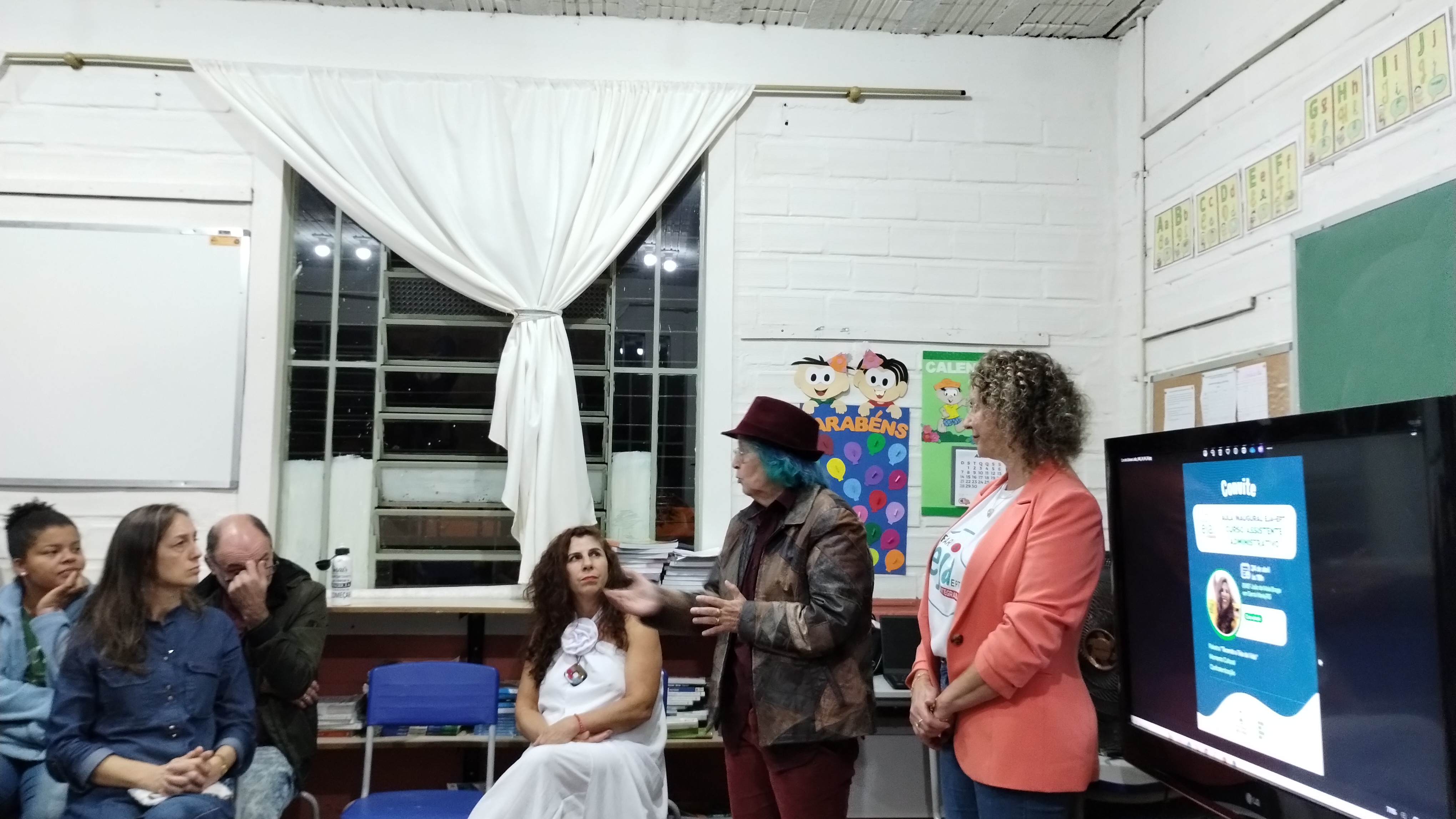 Por fim, chegou a vez de Edinara falar aos presentes. Ela iniciou falando que gosta muito do que faz e faz tudo de uma forma criativa, com entusiasmo. Colocou a música Alma, de Zélia Duncan para tocar e questionou como eles/as viam sua alma. As respostas apontaram para o lado positivo que vemos em nós mesmos, mas também das nossas sombras. Edinara continuou falando de sua experiência trabalhando com alunos/as do noturno, de como é diferente quando os/as estudantes são também trabalhadores/as e contou de quando propôs uma semana literária, eles/as fizeram, mas do seu jeito, alterando completamente a proposta inicial.