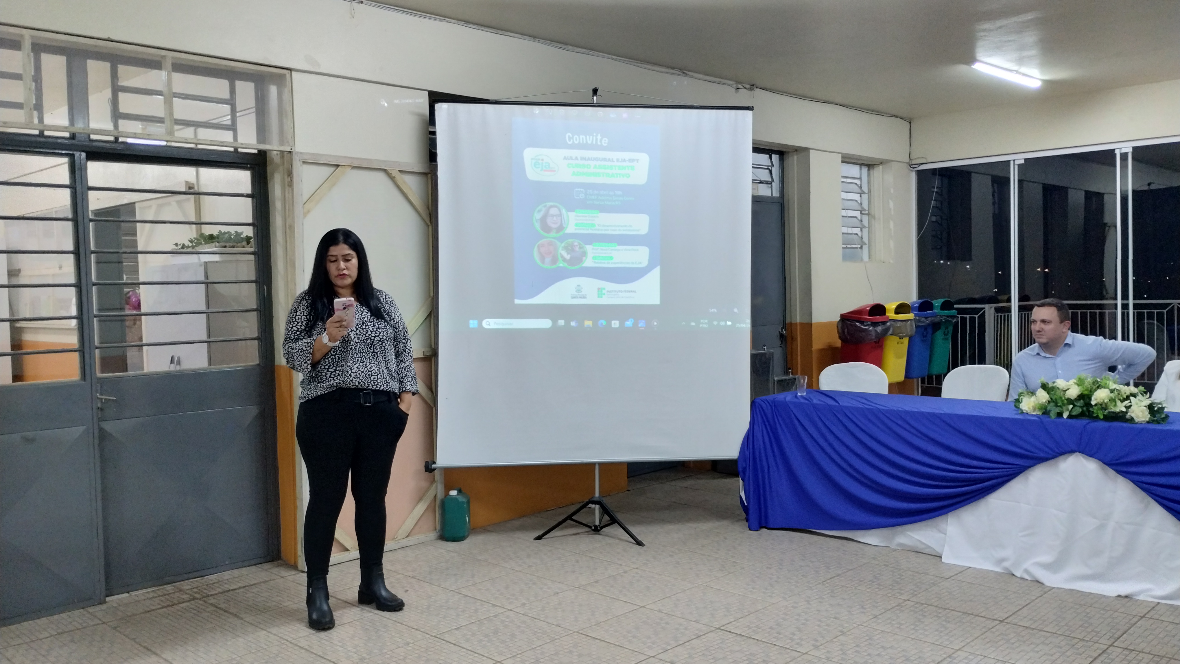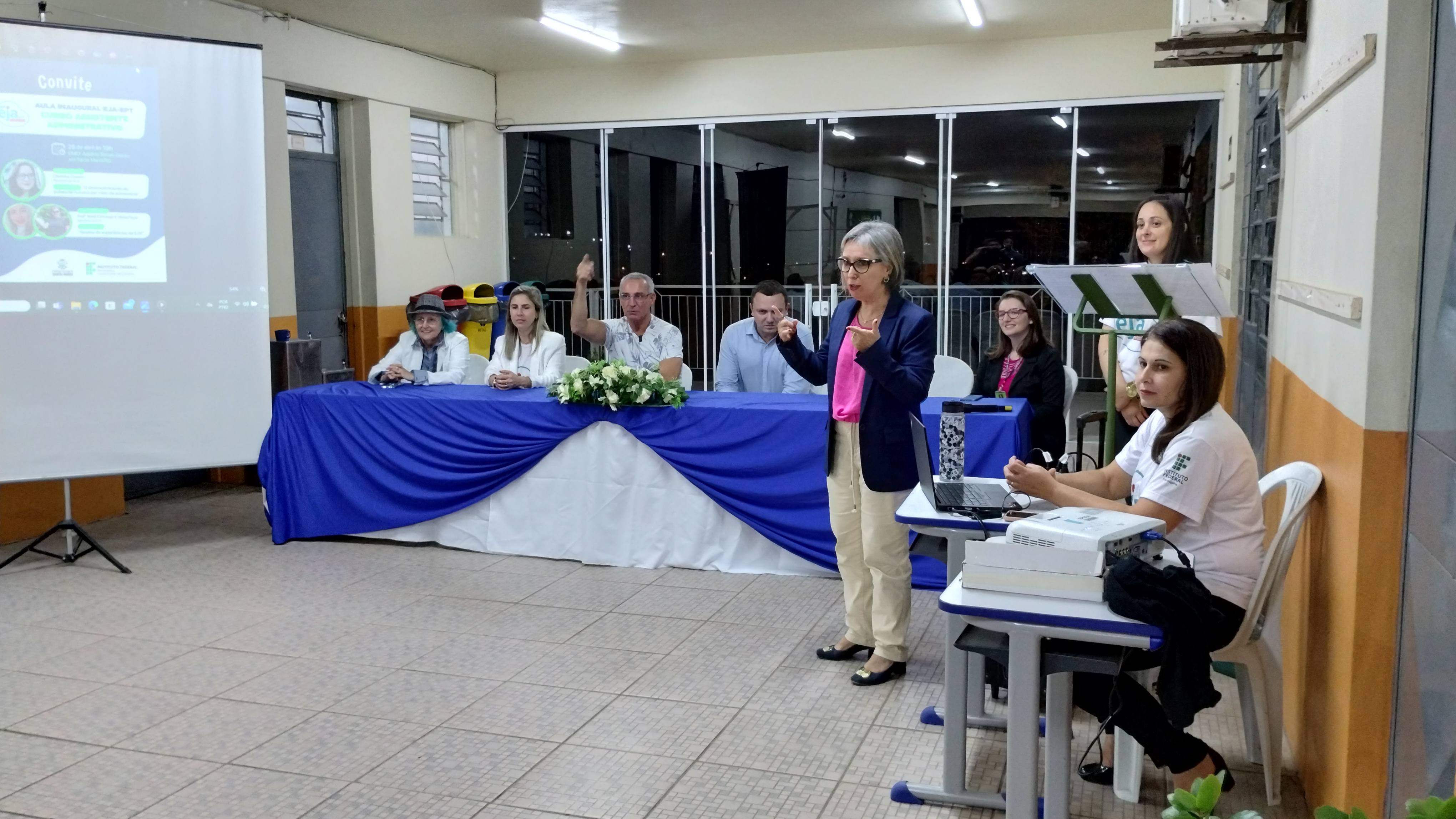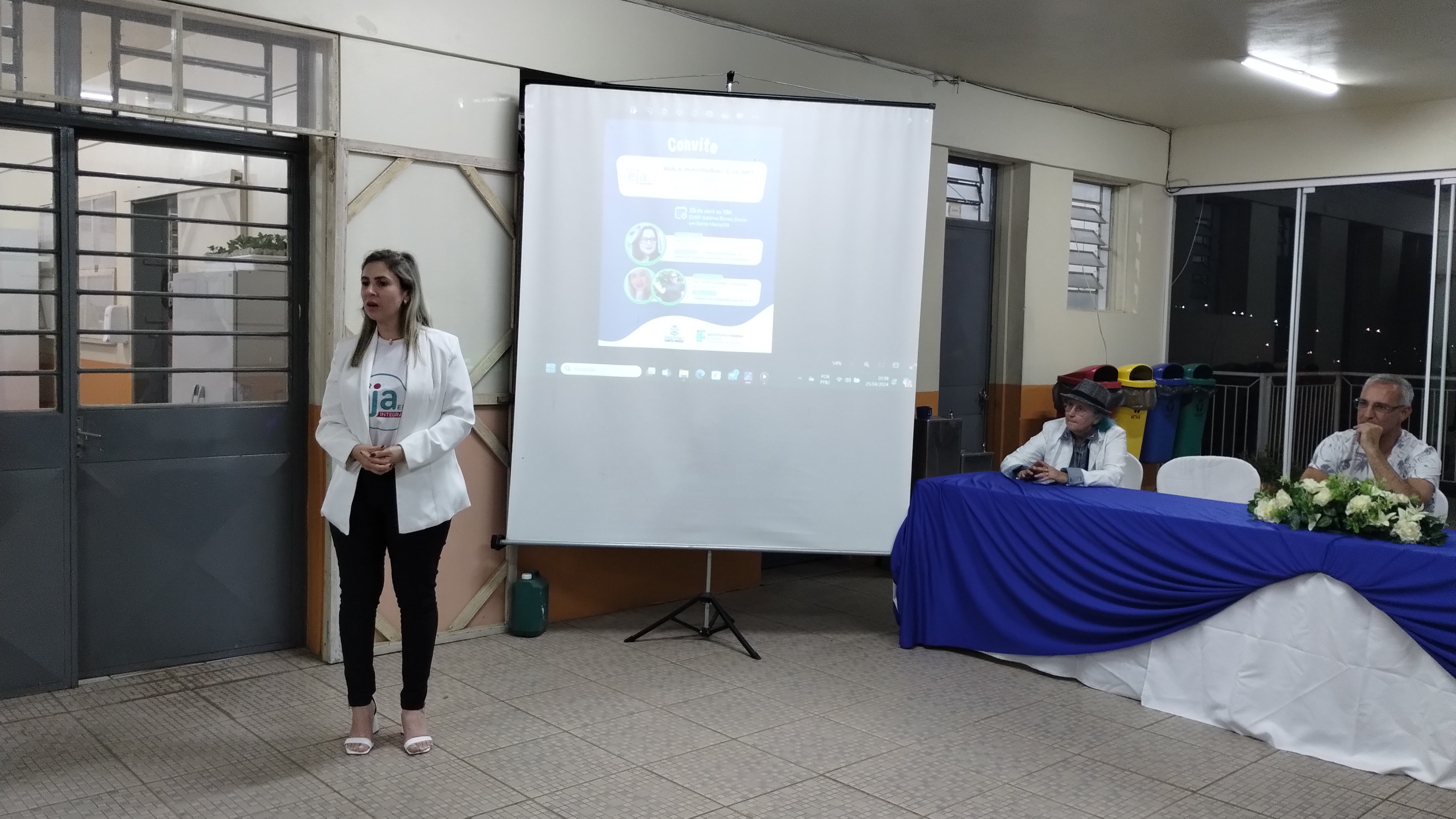 Na noite da quarta-feira (25/04) aconteceu a aula inaugural “O desenvolvimento do potencial humano por meio da autoestima”, com Cleonice Casarin” e “Relatos da EJA”, com Vânia Fleck e Noeli Camargo. Estiveram presentes o prefeito de Santa Maria, Jorge Pozzobom, a coordenadora da EJA da Secretaria de Educação, professora Deise Facco, a vereadora Luci Duarte “tia da moto”, a coordenadora da EJA no IFFar, Cleia Tonin, o diretor geral do campus Júlio de Castilhos, Rodrigo Carvalho Carlotto e a diretora da escola Adelmo Simas Genro, Bruna Zorzi da Costa.