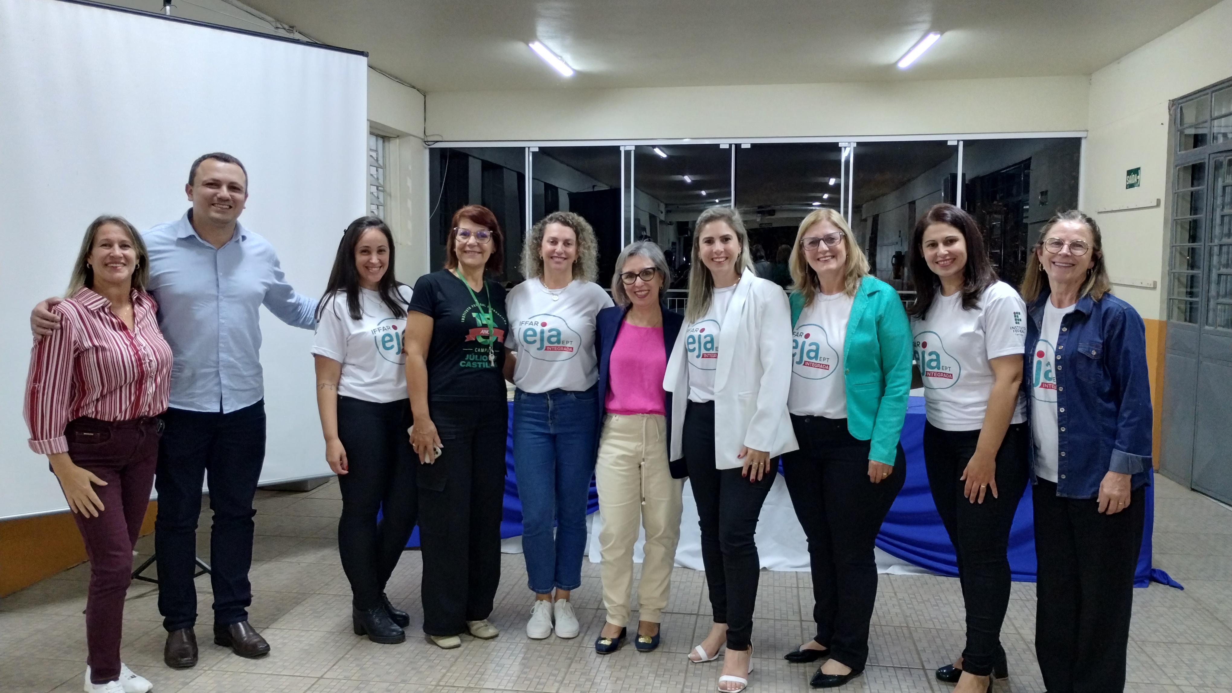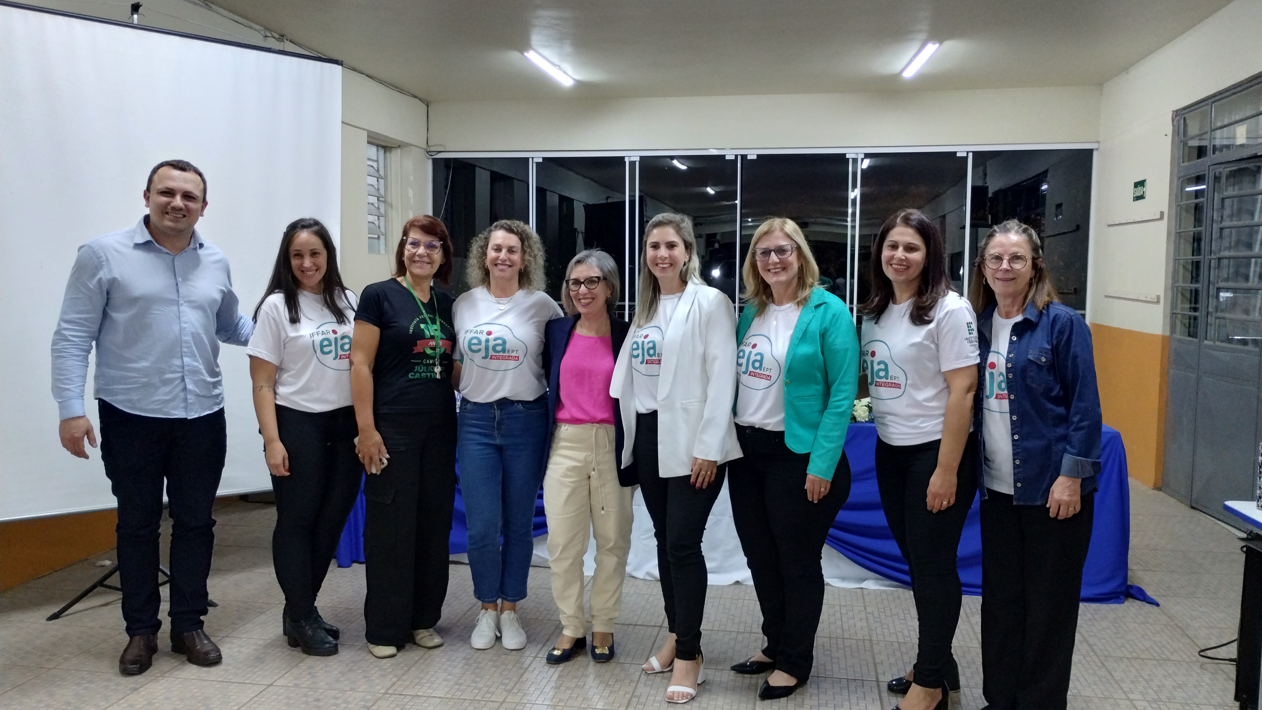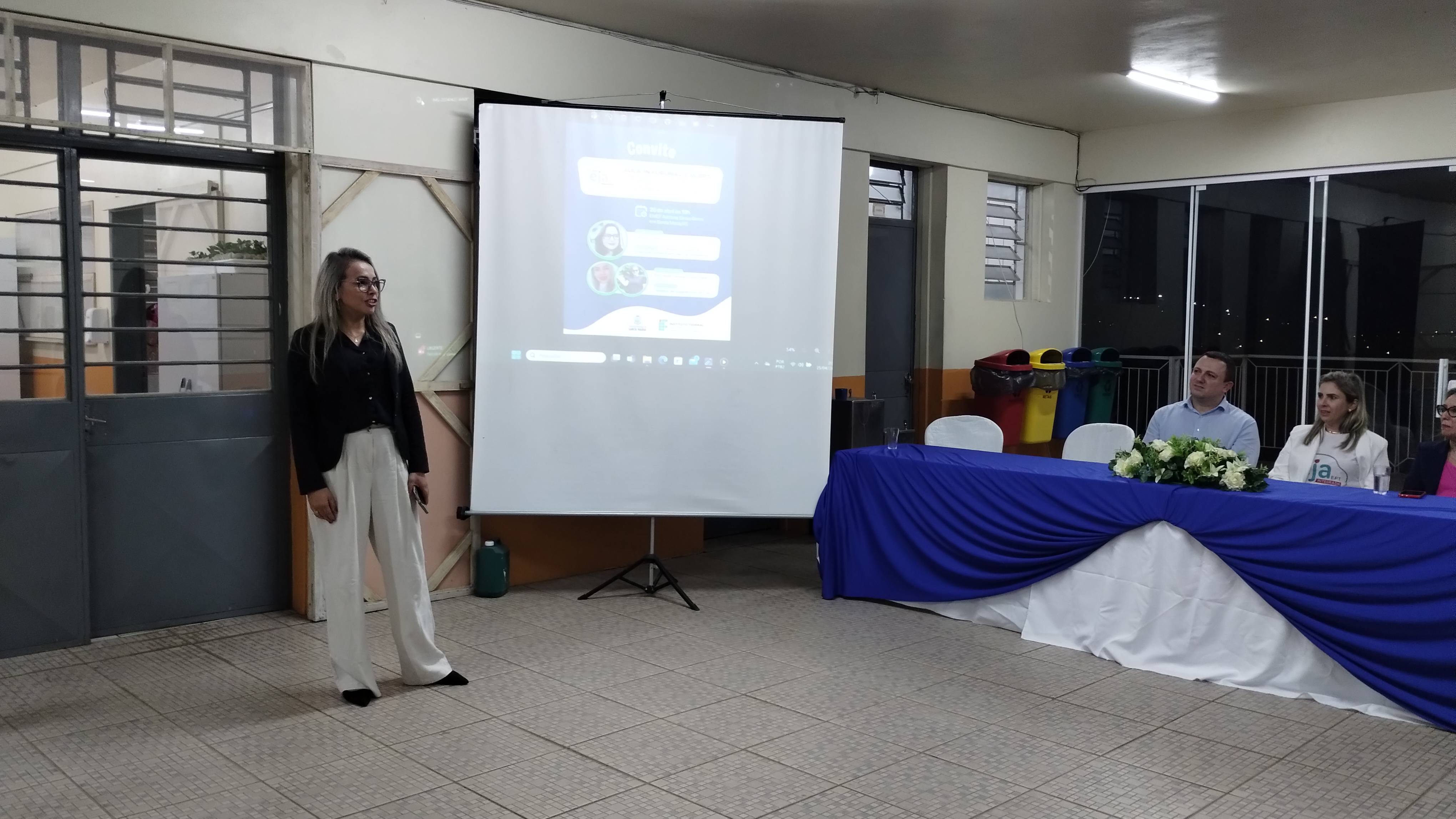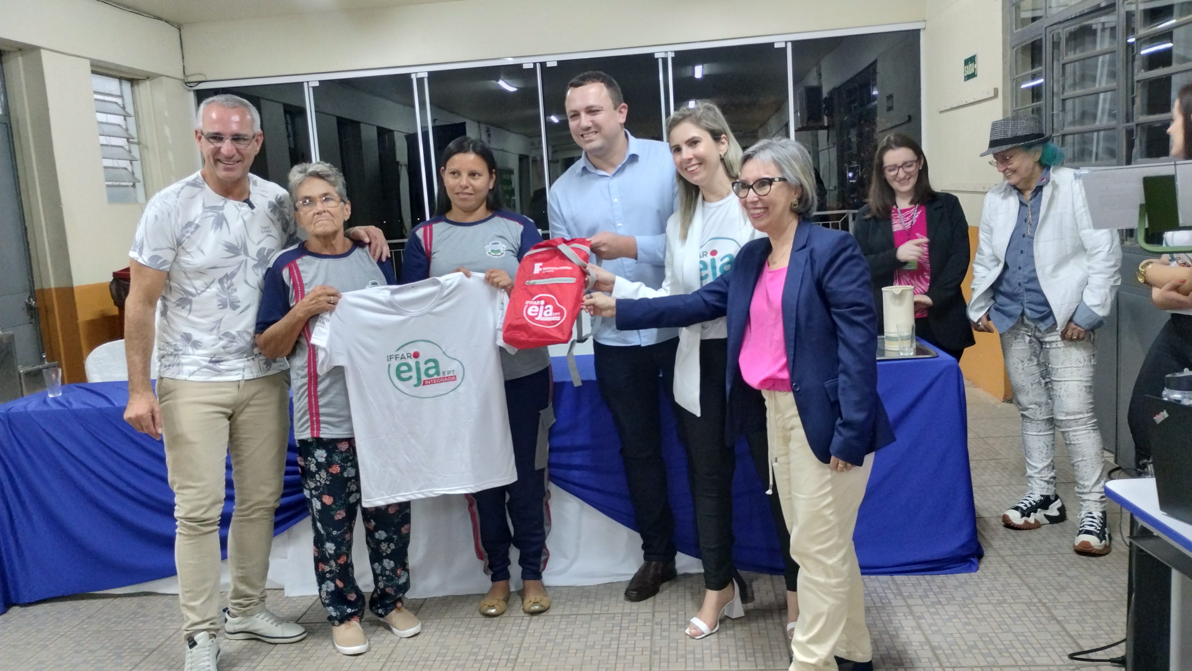 As falas tiveram início com Rodrigo, que destacou que o IFFar está há anos batalhando para melhorar a educação e a EJA faz parte dessa batalha. O diretor ressaltou que espera ver todos na formatura em dezembro de 2025. Em seguida, Cleia falou que o IFFar tem parceria com 11 municípios, 18 turmas de EJA com cerca de 20 estudantes cada; então fazemos diferença na vida de mais de 300 pessoas diretamente, nesse momento. Mas não impacta apenas na vida do/a estudante, mas também na vida dos familiares e da comunidade. “Vocês são alunos/as do IFFar e do Adelmo, não é para qualquer um estudar em duas instituições de qualidade. Venham para a escola, porque o tempo passa rápido, mas as mudanças na vida de vocês, permanece” disse a professora.