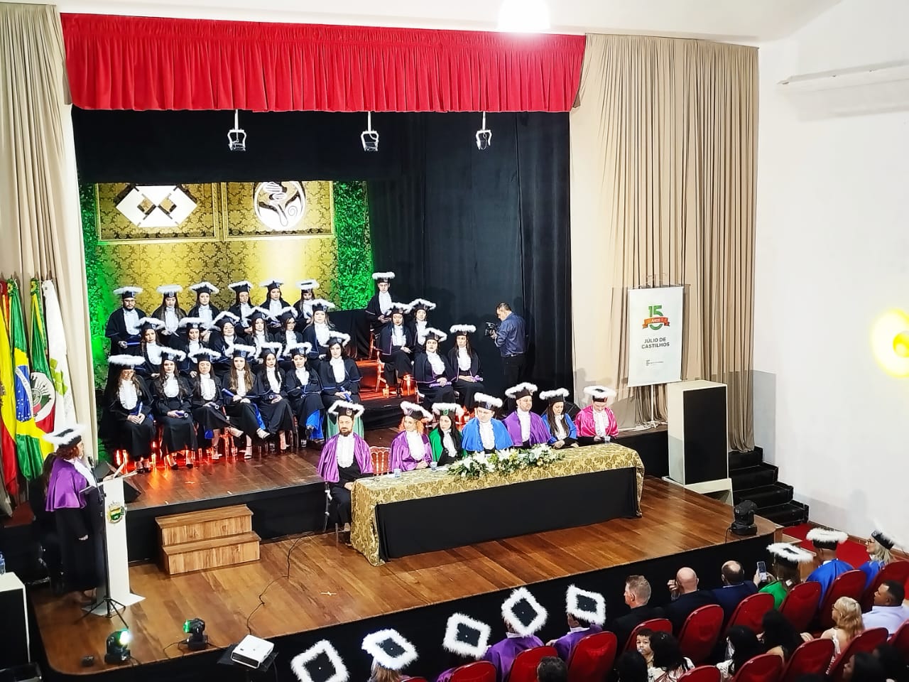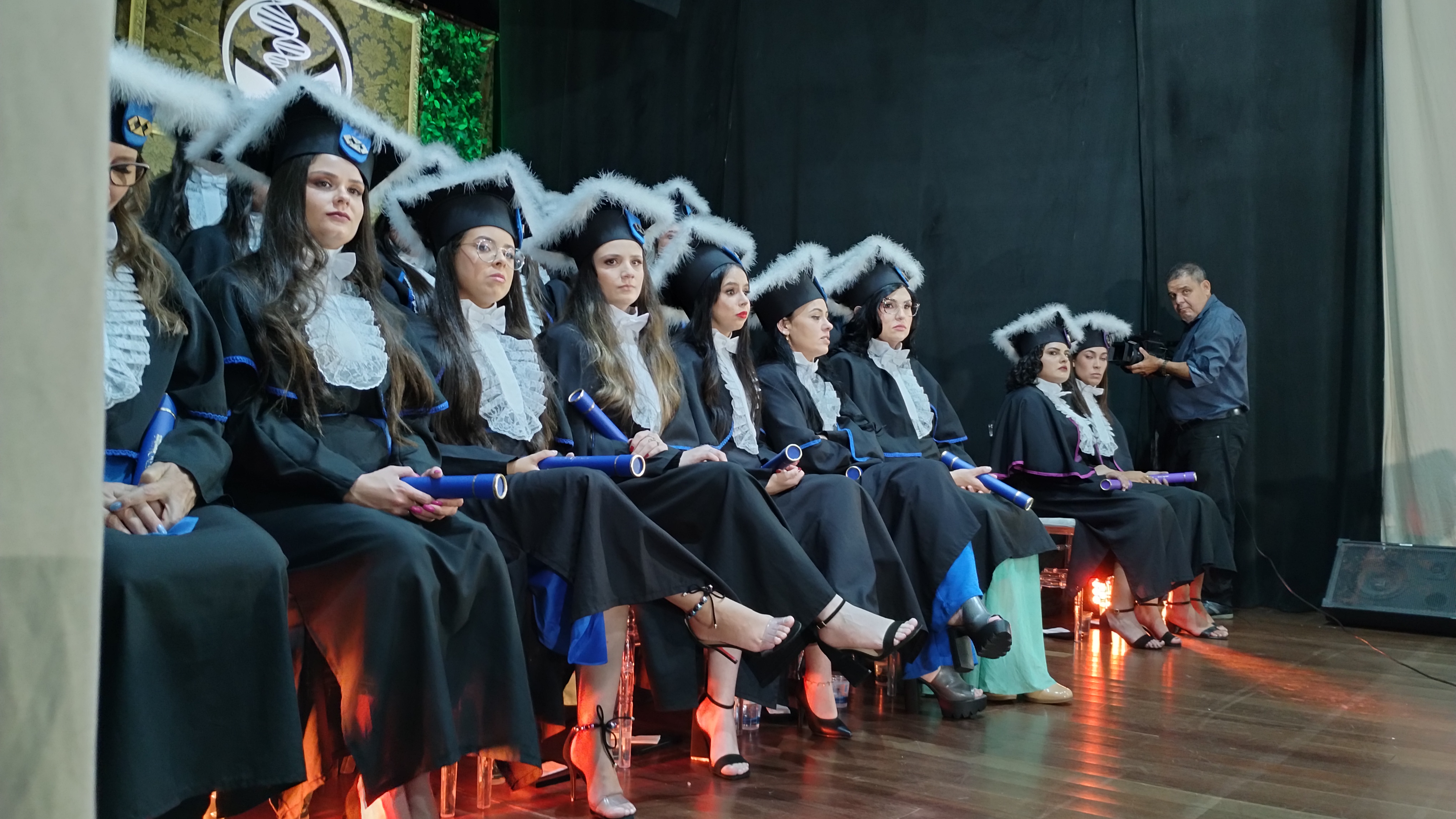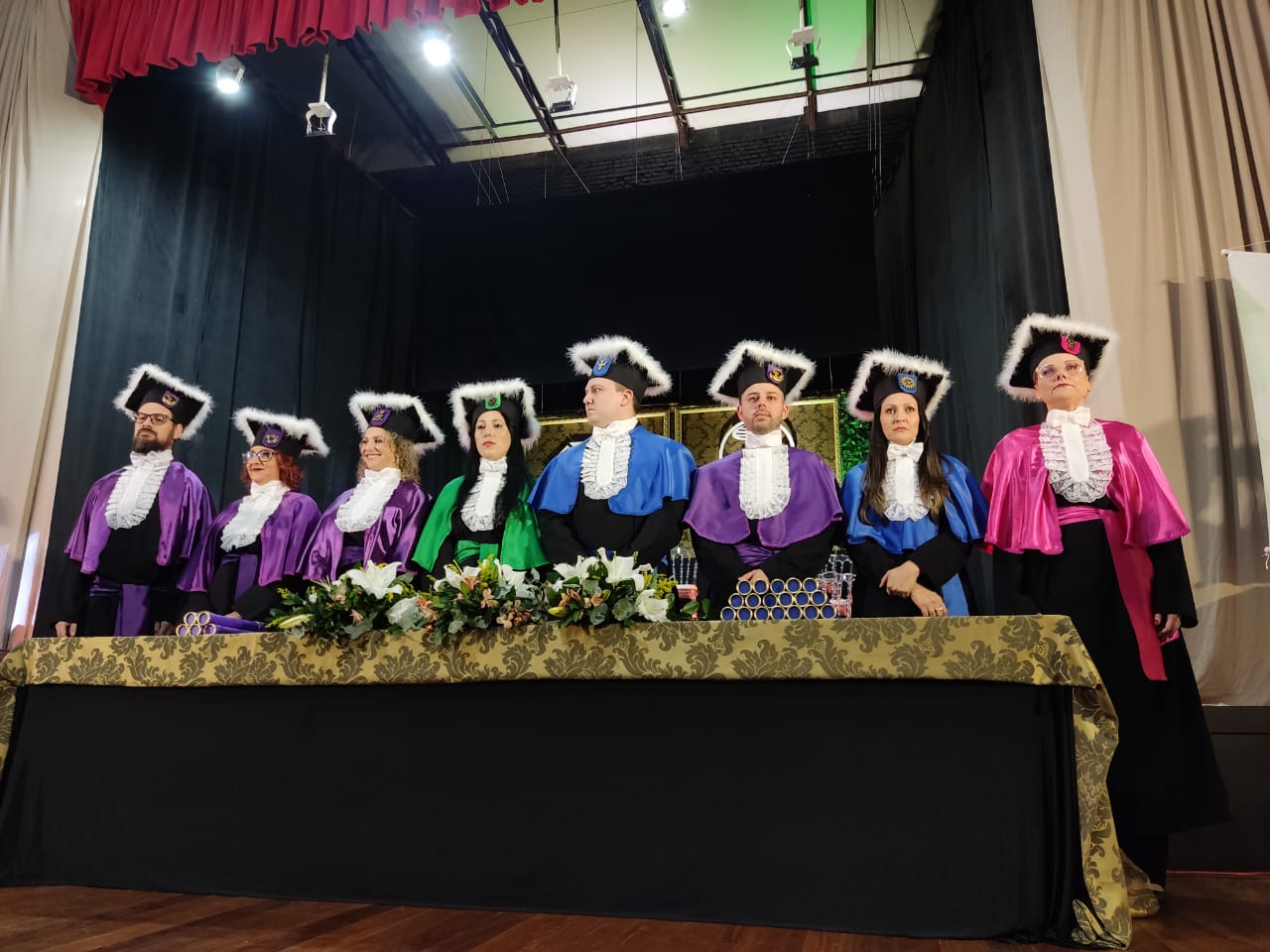 A colação de grau das turmas da Administração e das Ciências Biológicas aconteceu na sexta-feira, 26 de abril. Estiveram presentes a pró-reitora de ensino do IFFar, Patrícia Alessandra Meneguzzi Metz Donicht, diretor geral do Campus Júlio de Castilhos, Rodrigo Carvalho Carlotto, a diretora de ensino do Campus Júlio de Castilhos, Silvia Regina Montagner, coordenadora do curso de Bacharelado em Administração e Paraninfa da turma, Iochane Garcia Guimarães, coordenador do curso de Licenciatura em Ciência Biológicas, Anderson Saldanha Bueno, paraninfa do curso de Ciências Biológicas, Lucinara Bastiani Correa, patronesse do curso de Administração, Luci Inês Schumacher, patrono do curso de Ciências Biológicas, Rodrigo Koning e os/as homenageados/as Carine Dalla Valle, Carlos Alberto Júnior, Talita Gonçalves Posser, Cleonice Iracema Graciano, Frenanda Saccoori, Franchesco Della Flora, Joice Nara Rosa Silva e Landara Maitê Simon além de familiares e amigos/as dos/das concluintes.