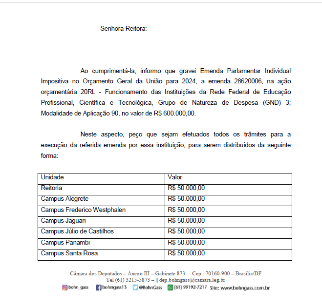Já a verba de R$50 mil reais do deputado federal, Elvino Bohn Gass foi através da emenda parlamentar individual na ação orçamentária 20RL - Funcionamento das Instituições da Rede Federal de Educação Profissional, Científica e Tecnológica, destinando R$600 mil reais ao IFFar, dividido igualmente entre as unidades.