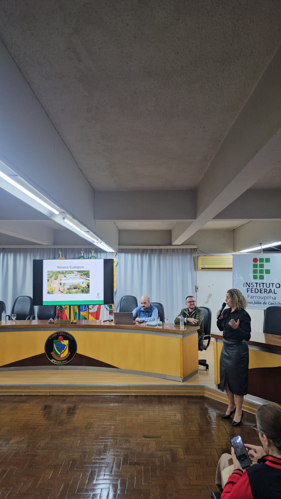 O Campus Júlio de Castilhos realizou dois eventos com o intuito de discutir a criação de novos cursos no Campus em 2027. Na semana passada foi realizada uma audiência pública na Câmara Municipal de Vereadores de Júlio de Castilhos para apresentar para a comunidade a proposta de criação de dois novos cursos e a extinção de outros dois. Estiveram presentes a diretora geral Silvia Regina Montagner, o pró-reitor de desenvolvimento institucional Carlos Rodrigo Lehn, o diretor de planejamento e desenvolvimento institucional Gabriel Garcia, os vereadores/as, Alice Ribeiro e José Wairich, representantes de escolas situadas no município e outras entidades e empresas do município.