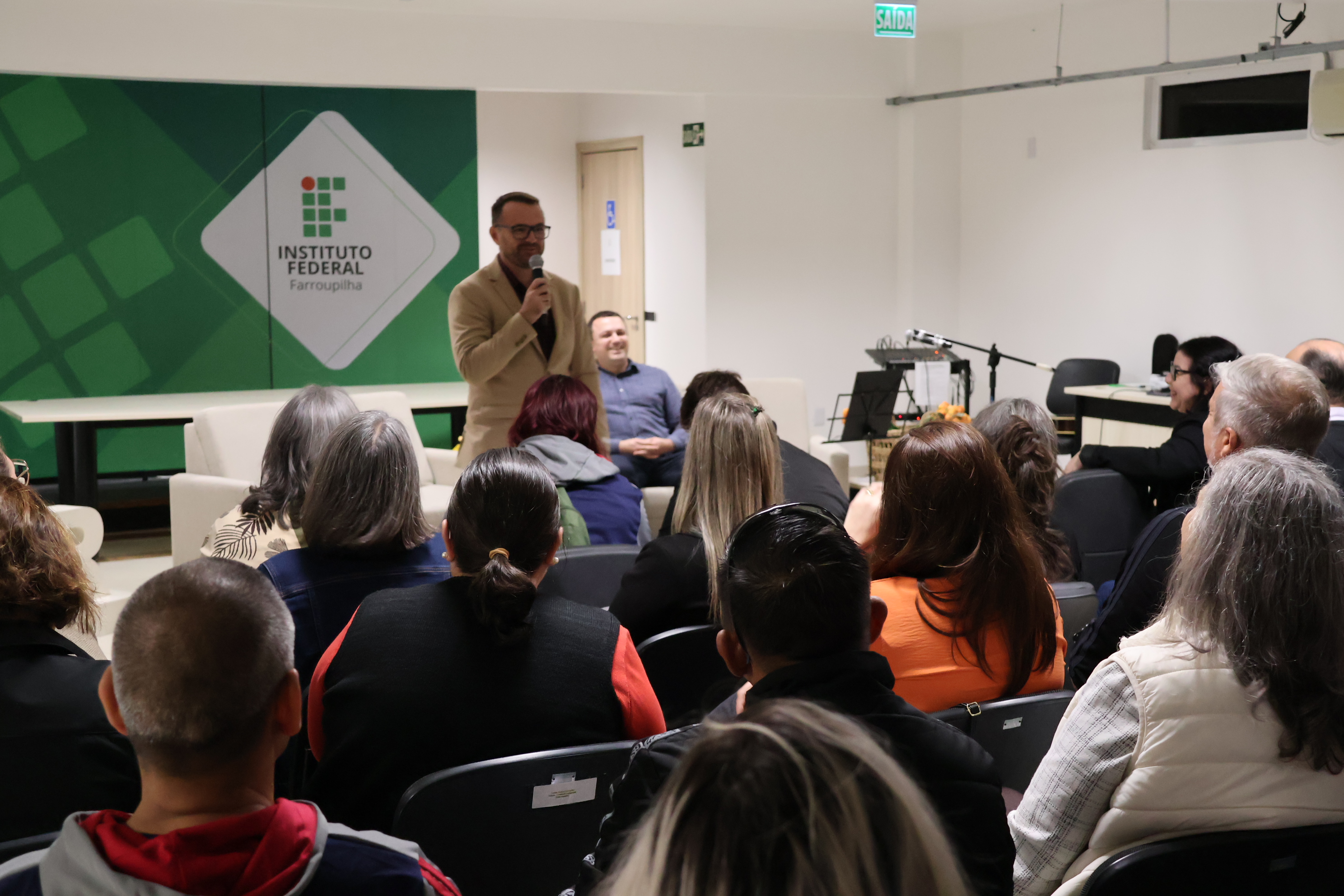 O psicólogo Rodrigo Carvalho Carlotto, do Campus Júlio de Castilhos, também participou da atividade. Em sua fala, destacou a importância do acolhimento emocional no ambiente educacional: "Cada um que está aqui carrega uma vivência única. O cuidado emocional também faz parte do processo de aprendizagem", observou. Além disso, a intervenção de Carlotto com os presentes foi intercalada com reflexões sobre vivências na EJA e músicas, proporcionando um ambiente acolhedor aos estudantes.