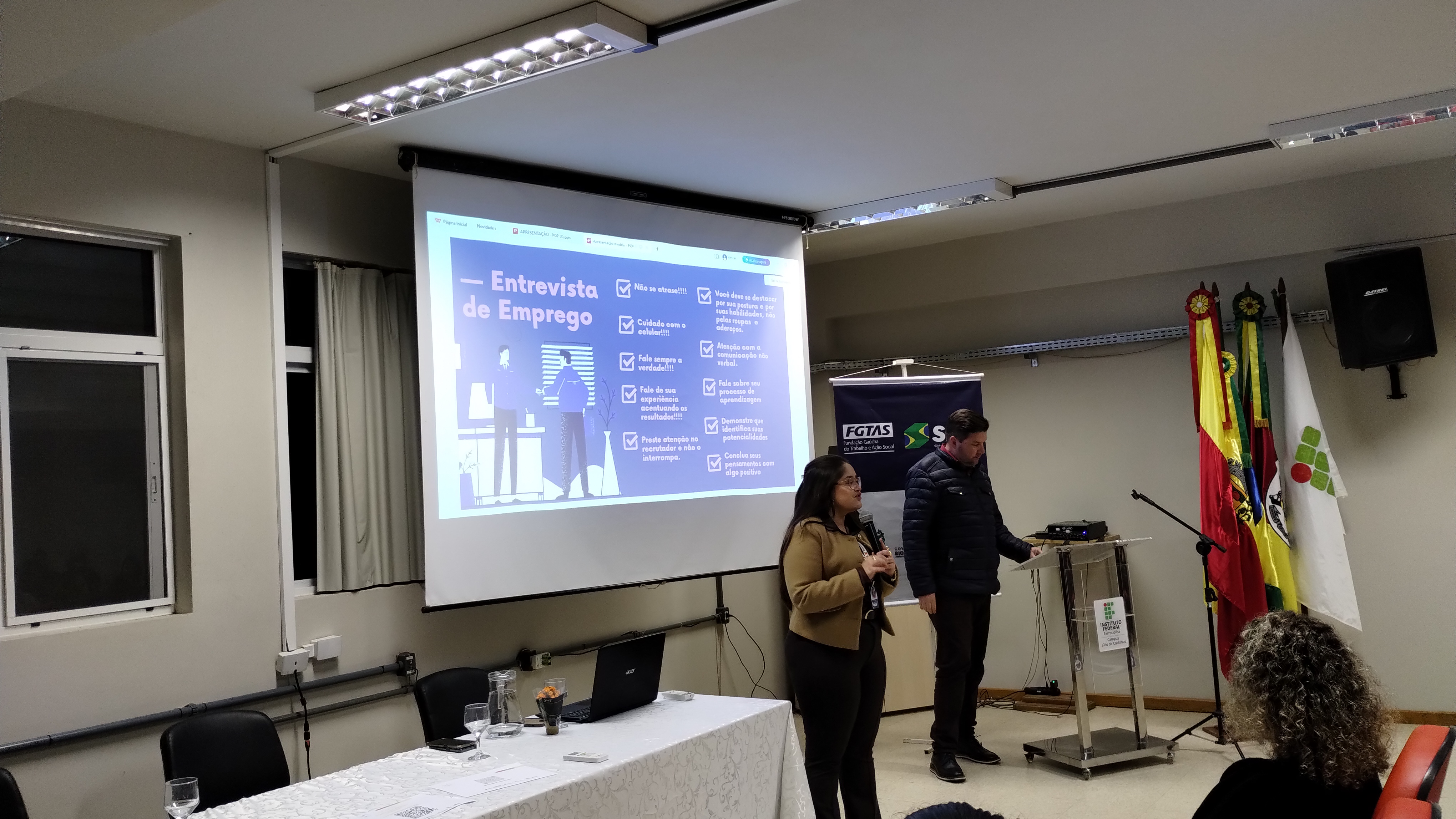 Natalia Dias e Ricardo Monteiro, da agência FGTAS/Sine de Júlio de Castilhos fizeram uma palestra no campus na segunda-feira, 18 de agosto, dividida em dois momentos: pela manhã para as turmas do integrado e à noite para estudantes da gradução, subsequente e EJA/EPT.