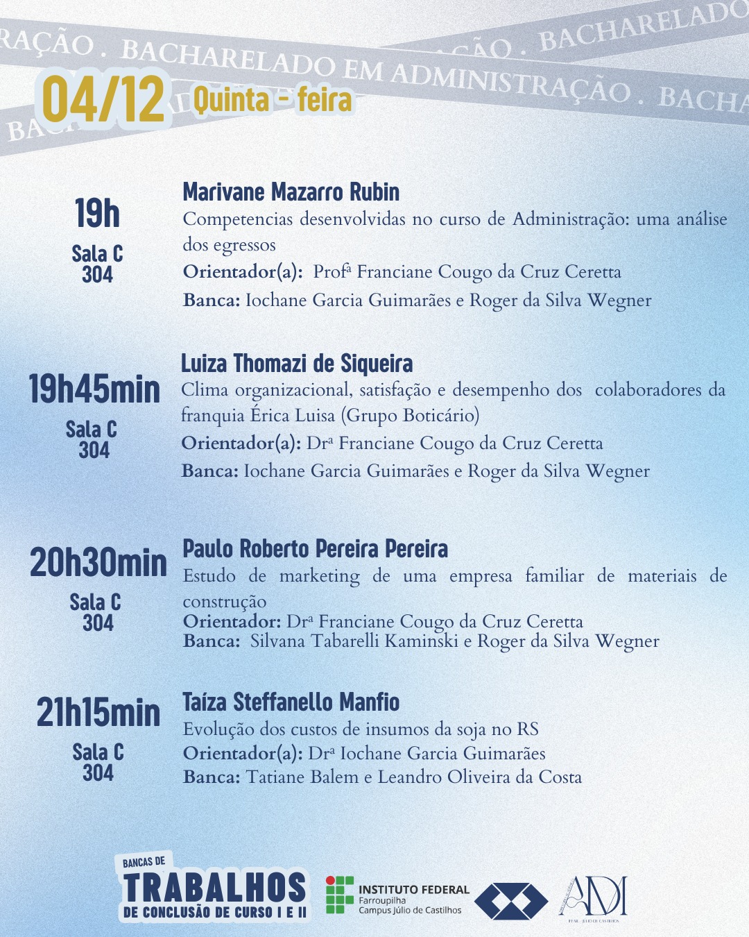 Entre os dias 1º, 2 e 4 de dezembro de 2025, o Campus Júlio de Castilhos contará com um dos momentos mais importantes para os acadêmicos do Curso de Bacharelado em Administração: as bancas de defesa dos Trabalhos de Conclusão de Curso I e II (TCCs).
