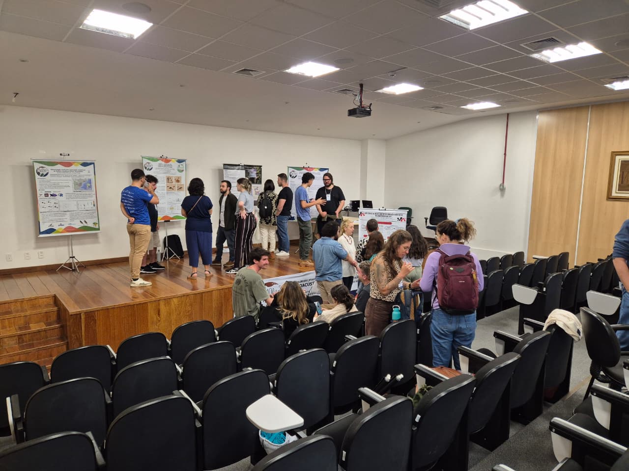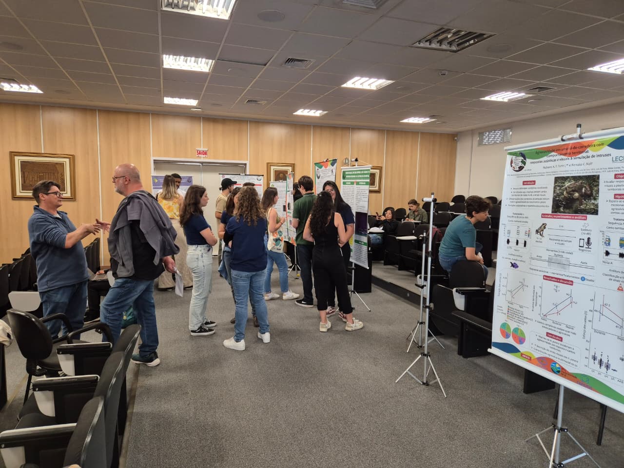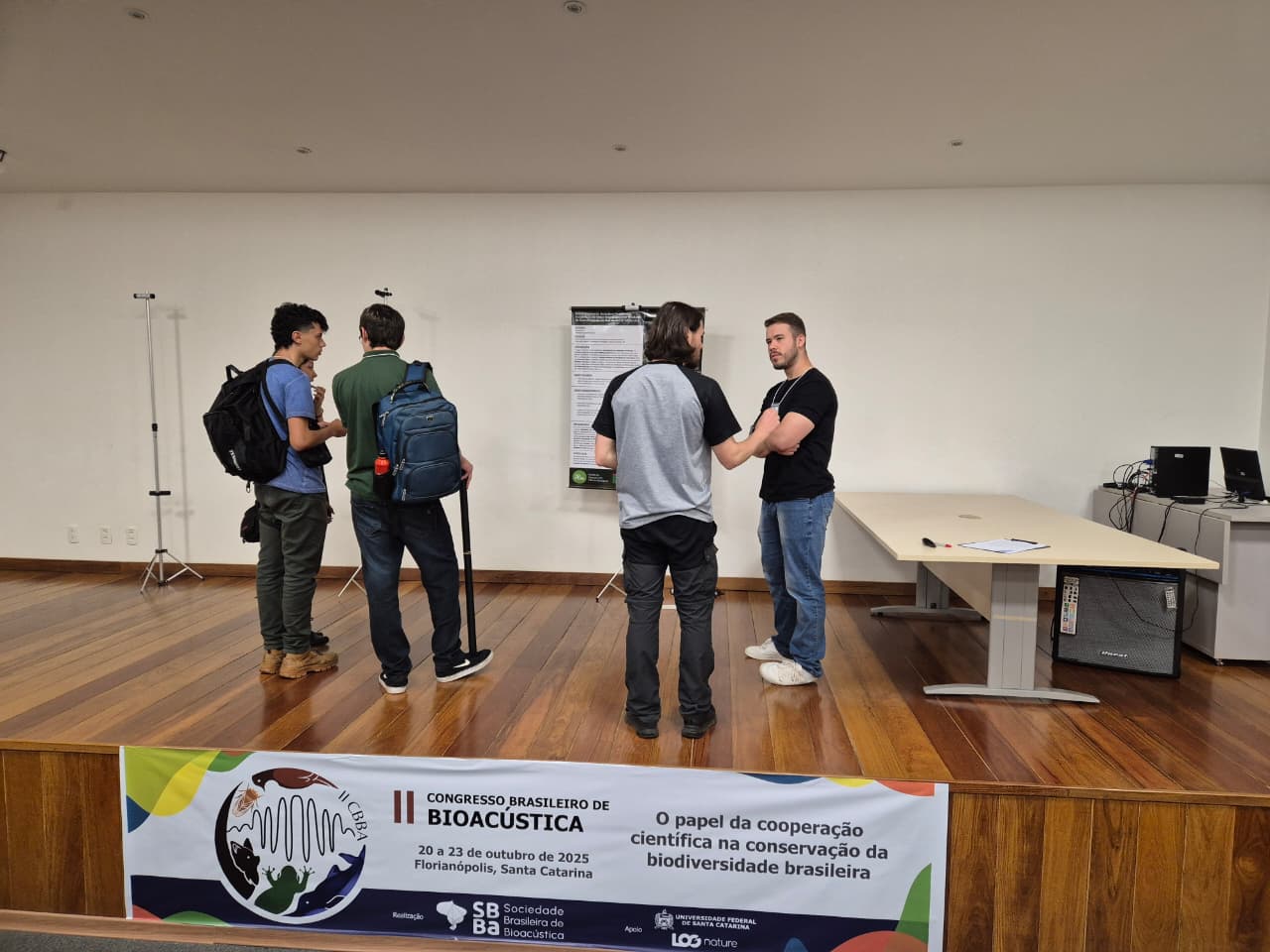 Felipe Brum (vestindo camiseta preta) apresenta o pôster premiado durante o II Congresso Brasileiro de Bioacústica, em Florianópolis/Foto: Divulgação