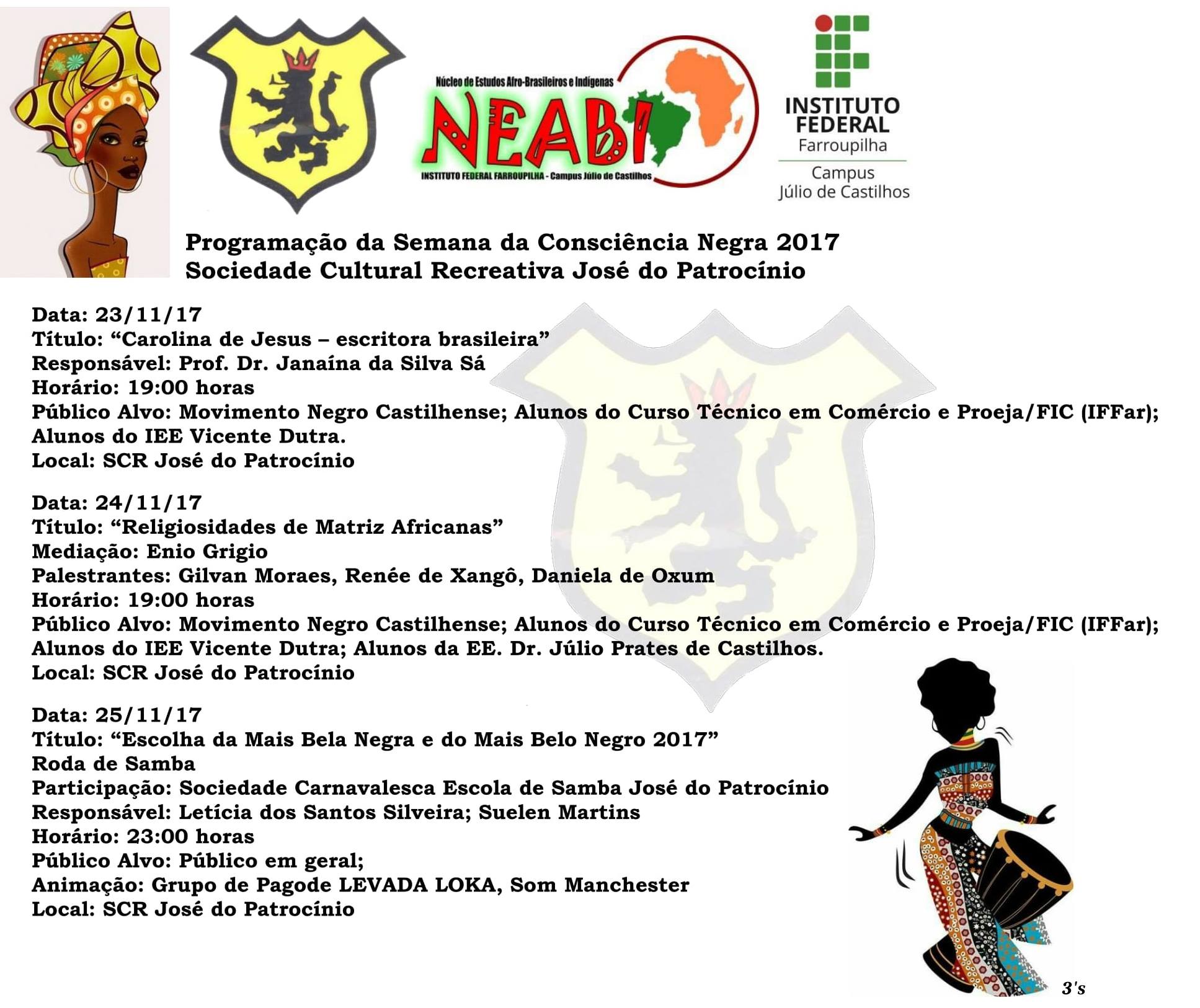 A programação teve início no dia 11 de novembro com oficinas semanais sobre o tema para estudantes do Campus Júlio de Castilhos e das escolas do município, Movimento Negro Castilhense e, no Campus Santo Ângelo e na UFSM, sob a coordenação do professor Dr. Aristeu Castilhos da Rocha. No dia 23, a professora Dra. Janaina da Silva Sá do Campus, Júlio de Castilhos ministrou a palestra " Carolina Maria de Jesus - uma escritora brasileira". No dia 24, foi a vez do professor Dr. Enio Grigio mediar a mesa de debates sobre Mesa: " Reflexões sobre religiosidades de matriz africana " com os convidados Gilvan Silveira Moraes, Rene Quevedo, Daniela de Oxum.