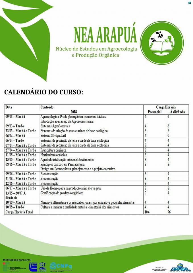 Hoje (9) iniciaram as atividades do Curso Básico de Agroecologia promovido pelo NEA Arapuã, no Anfiteatro do Campus. Com o tema "Construindo Novas Relações entre a Sociedade e a Natureza o curso tem carga horária de 180 horas. Durante a formação serão abordados, entre outros temas, Agroecologia e Produção Orgânica: conceitos básicos; Sistemas Agroflorestais; Fruticultura e Horticultura Orgânicas; Bioconstrução e Uso da homeopatia na produção animal e vegetal.