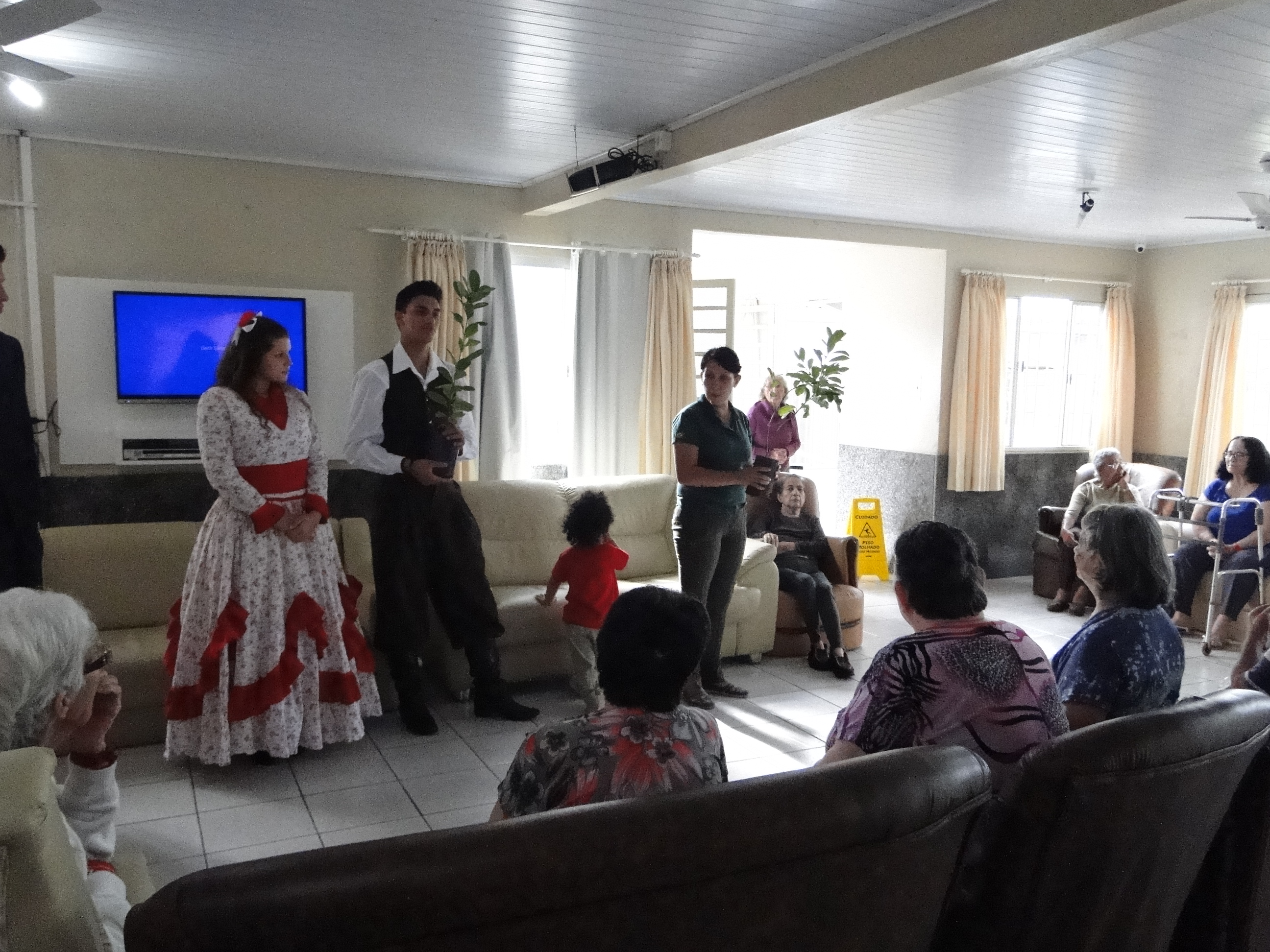 No dia 04 de abril aconteceu no Lar recanto do Amanhecer, em Júlio de Castilhos, a primeira intervenção do Projeto de Extensão “NTG Alma Farrapa e Lar Recanto do Amanhecer – valorização da terceira idade”. O projeto tem como objetivo unir educação, arte, cultura gaúcha e integração social, por meio de interações entre os jovens participantes do Núcleo de Tradições Gaúchas e os idosos residentes no Lar.