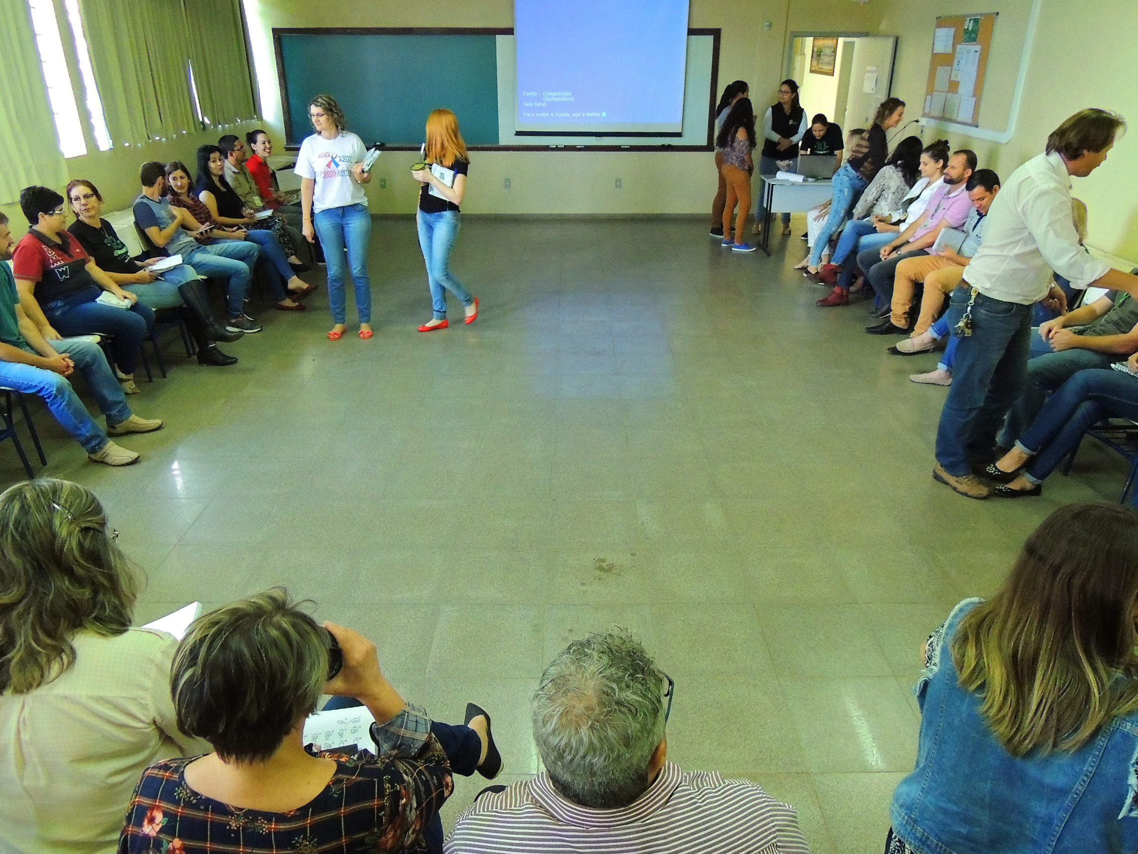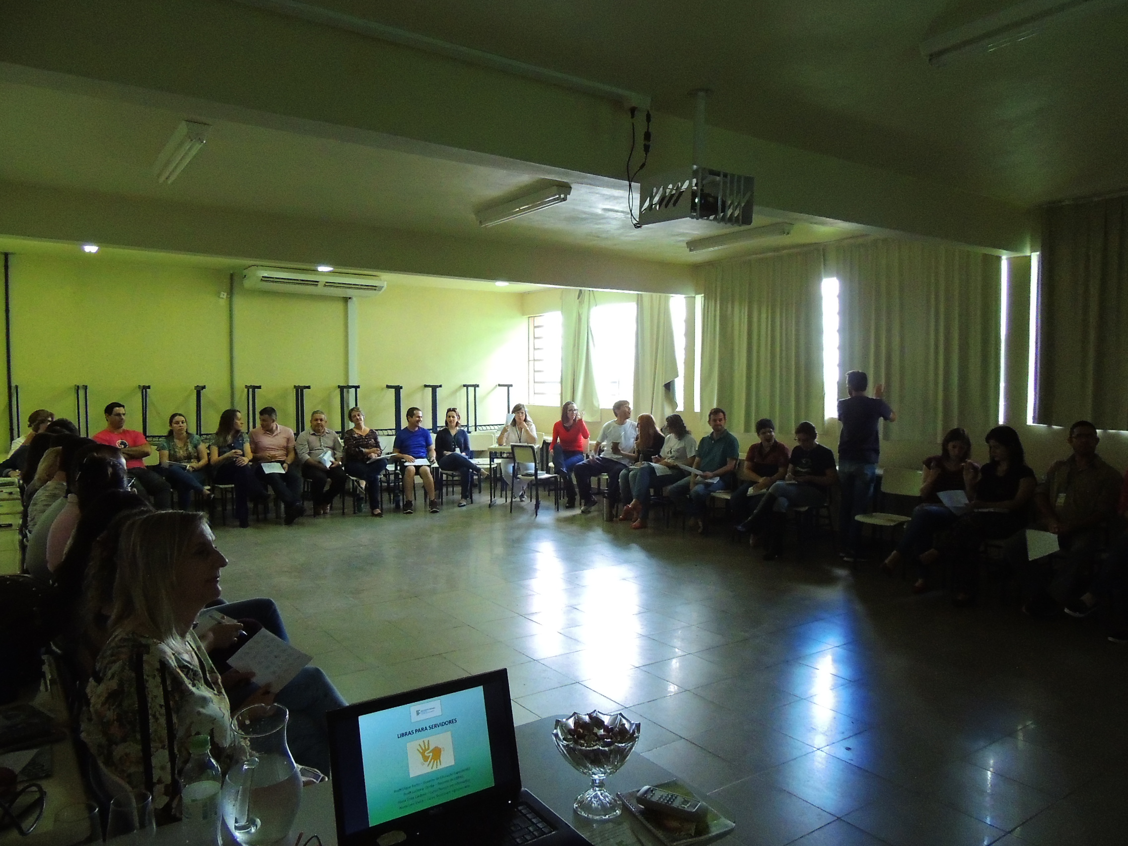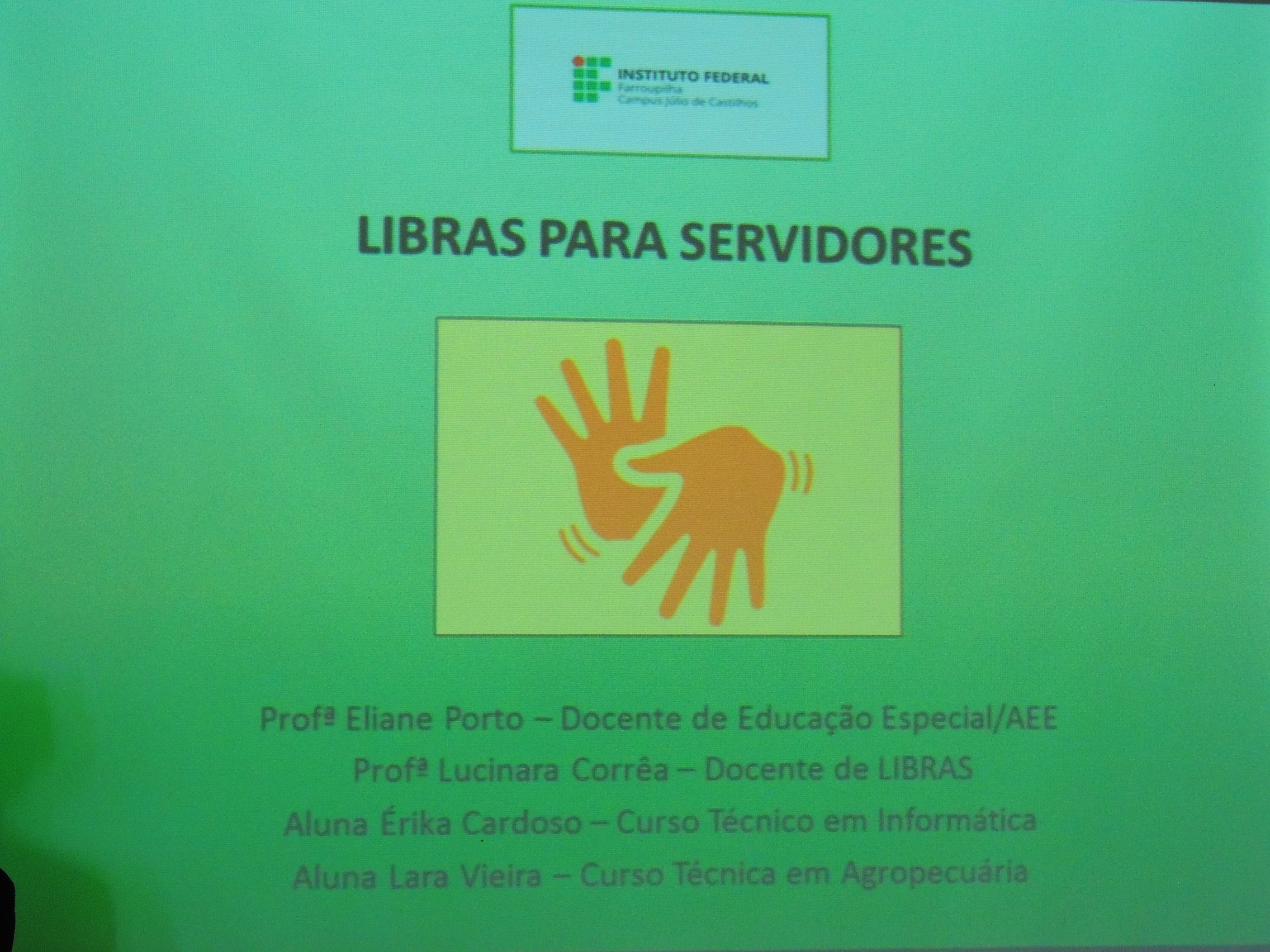 Promover ações articuladas com a Coordenação de Ações Inclusivas divulgando atividades a servidores e alunos e capacitar os docentes e técnicos-admiistrativos em libras e metodologias para alunos com necessidades de atendimento especializado são alguns dos objetivos do Projeto " "Repensando o ensino e a Aprendizagem: Planejamento, Metodologia e Avaliações" . Nesse contexto está acontecendo a capacitação em libras para os servidores do Campus. O curso é ministrado pelas docentes, de Libras Lucinara Correa e de Atendimento Educacional Especializado, Eliane Porto e as estudantes Surdas dos cursos técnicos integrados Erika Cardoso e Lara Pereira.