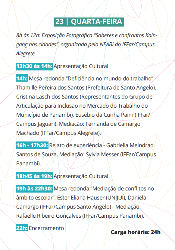 O evento ocorrerá no auditório do IFFar - Campus Panambi nos dias 22 e 23 de outubro (terça e quarta), com programação nos turnos da tarde e da noite.