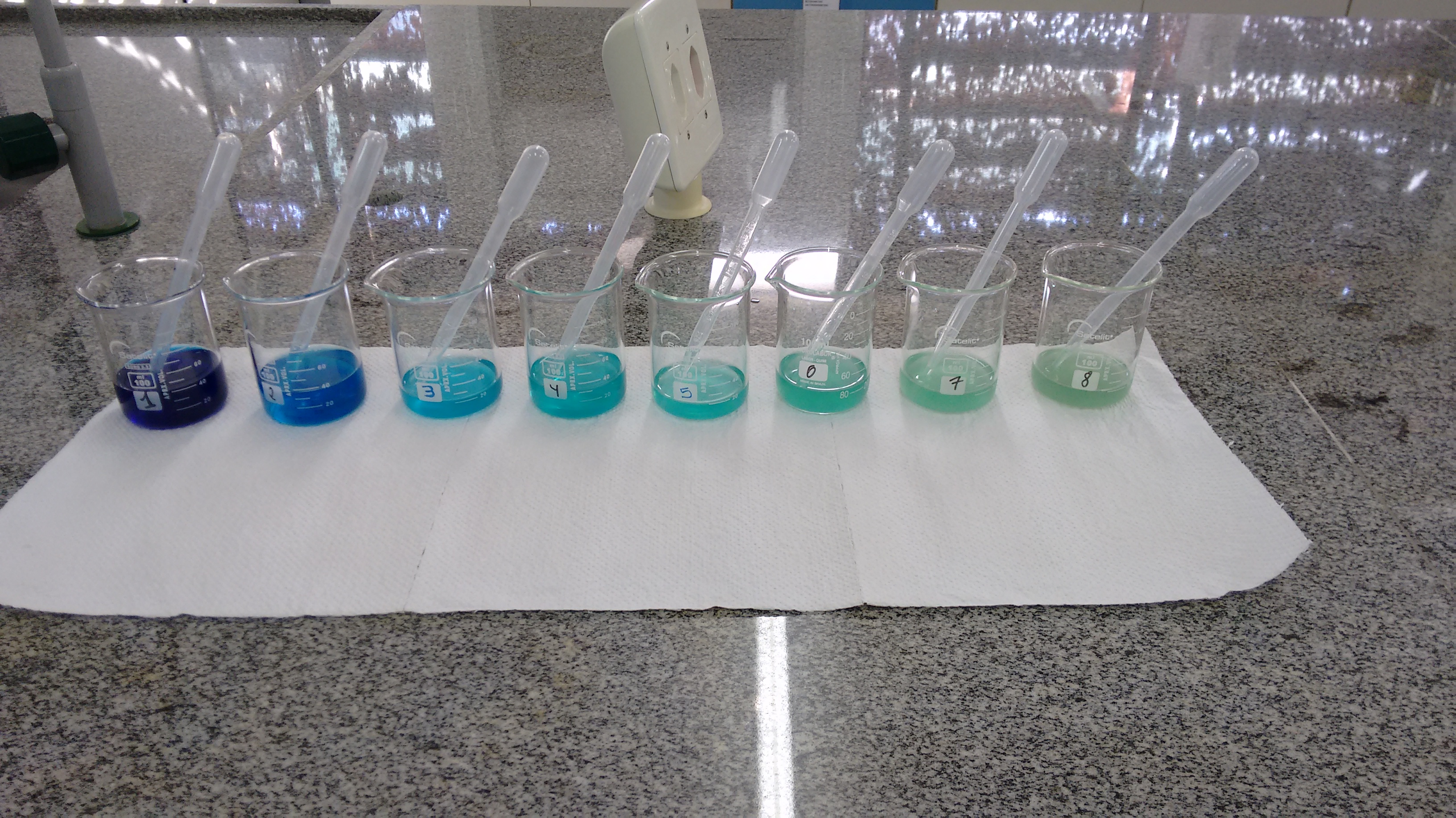 Figura 2. Resultado após ensaios de adsorção: da esquerda para a direita, mais quantidade de adsorvente foi adicionada, menor a intensidade de cor é notada (corante azul de metileno)