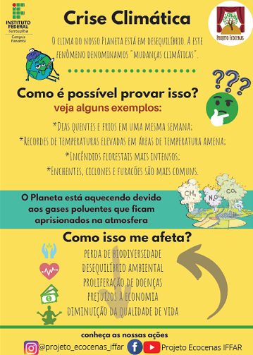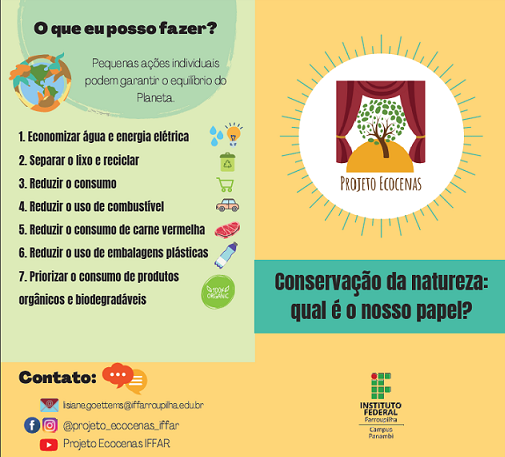Com o propósito de ampliar a conscientização, o cuidado, as ações positivas para com o planeta terra, os participantes das atividades do projeto elaboram mensagens reflexivas e interativas sobre temáticas ambientais. O material produzido é socializado em redes sociais digitais e/ou em visitas e oficinas desenvolvidas de forma online diretamente em escolas. O @projeto_ecocenas_iffar pode ser localizado no Instagram, Facebook e Youtube.