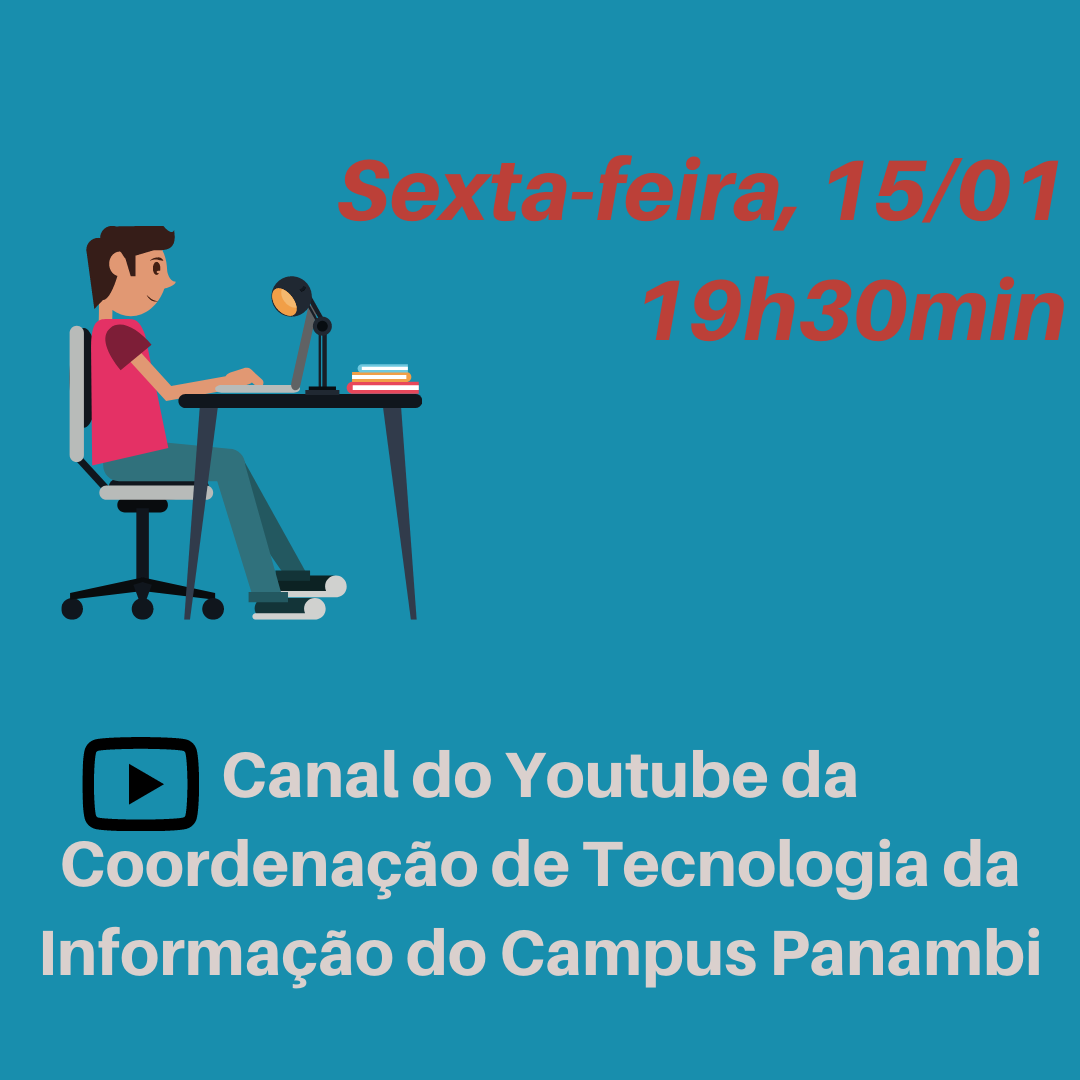 A atividade será transmitida pelo canal do Youtube da Coordenação de Tecnologia da Informação do Campus Panambi, pelo link https://youtu.be/NAMLZ5aokeM. Os participantes poderão interagir com perguntas e comentários durante o chat.