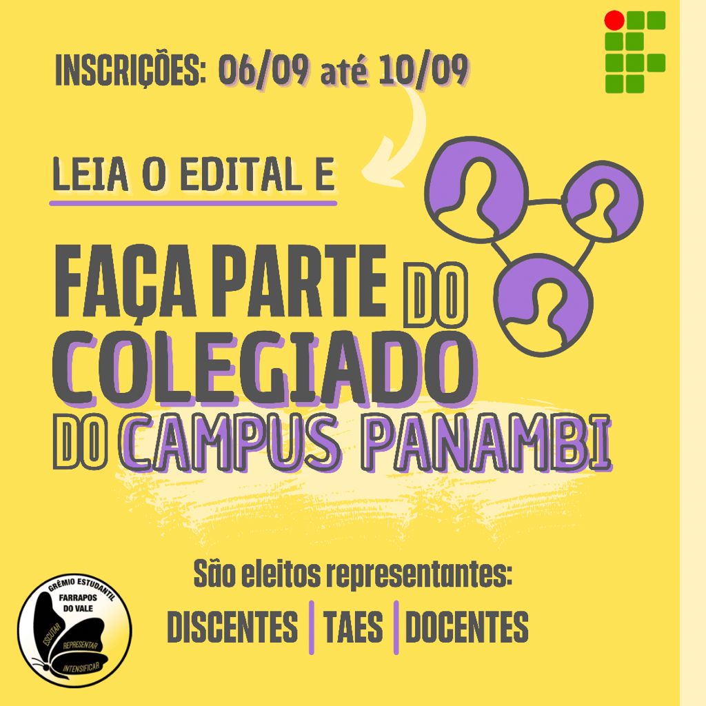 No dia 22/09, entre 10h às 20h, ocorrerá o processo de consulta para eleição dos novos membros do Colegiado do Campus Panambi. O voto para escolha dos representantes de cada categoria será facultativo, direto, secreto e uninominal.