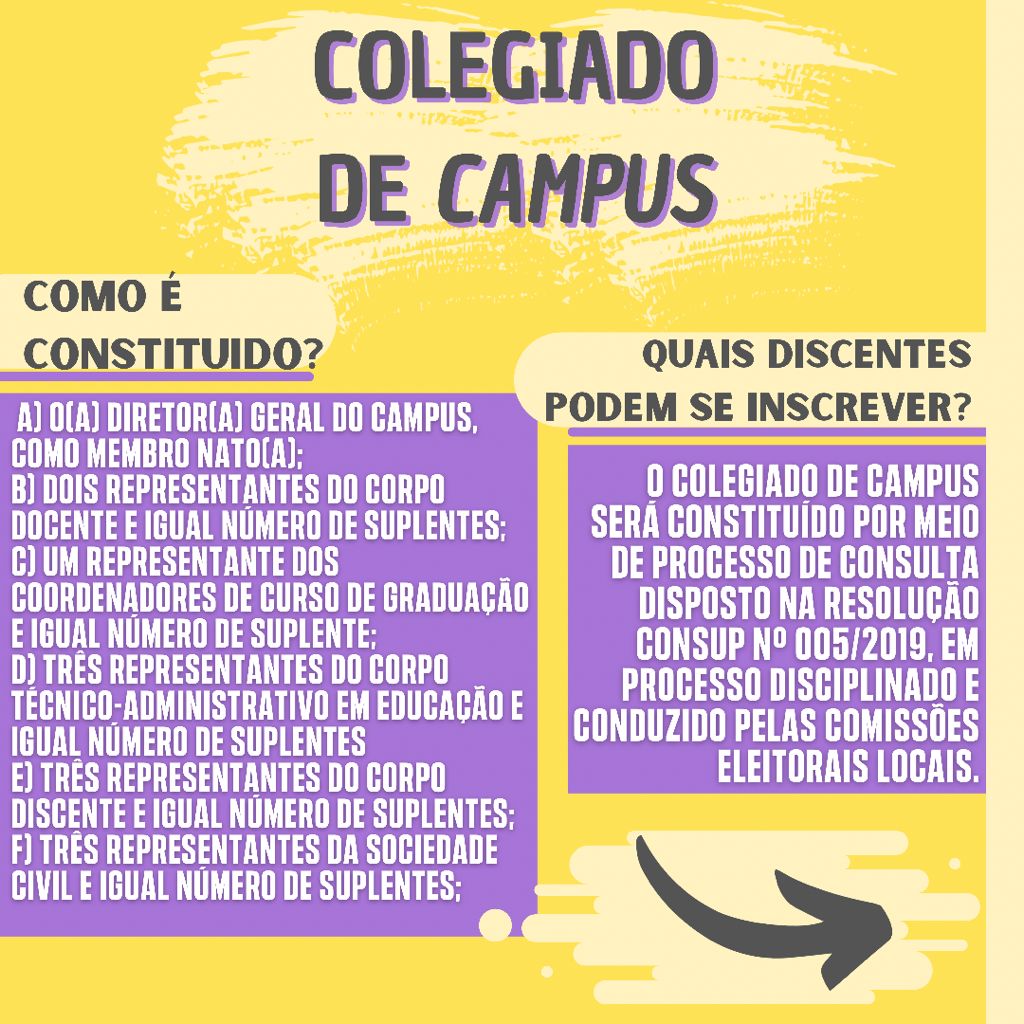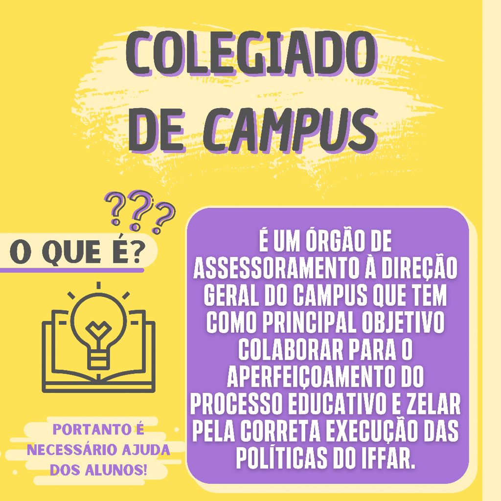 O Colegiado de campus é um órgão consultivo, no âmbito dos campi, com atribuição de assessorar a Direção Geral, colaborar para o aperfeiçoamento do processo educativo e zelar pela correta execução das políticas do IFFar.