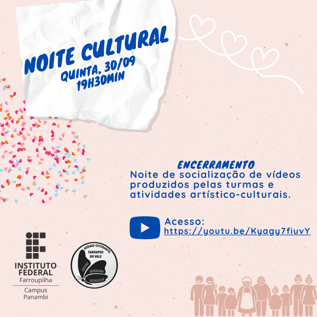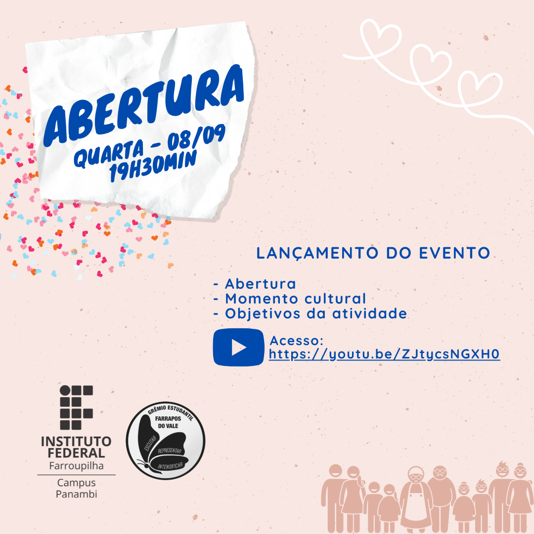 30/09 – 19h30min - Encerramento do mês da família, com contação de causos a apresentação de vídeos com atividades do cotidiano que envolvam estudantes e famílias.