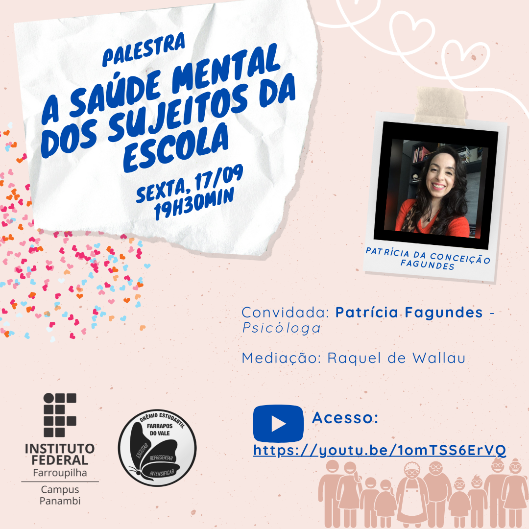 17/09 - 19h30min (sexta) - Palestra "A saúde mental dos sujeitos da escola em tempos de pandemia", com Patrícia Fagundes (psicóloga)