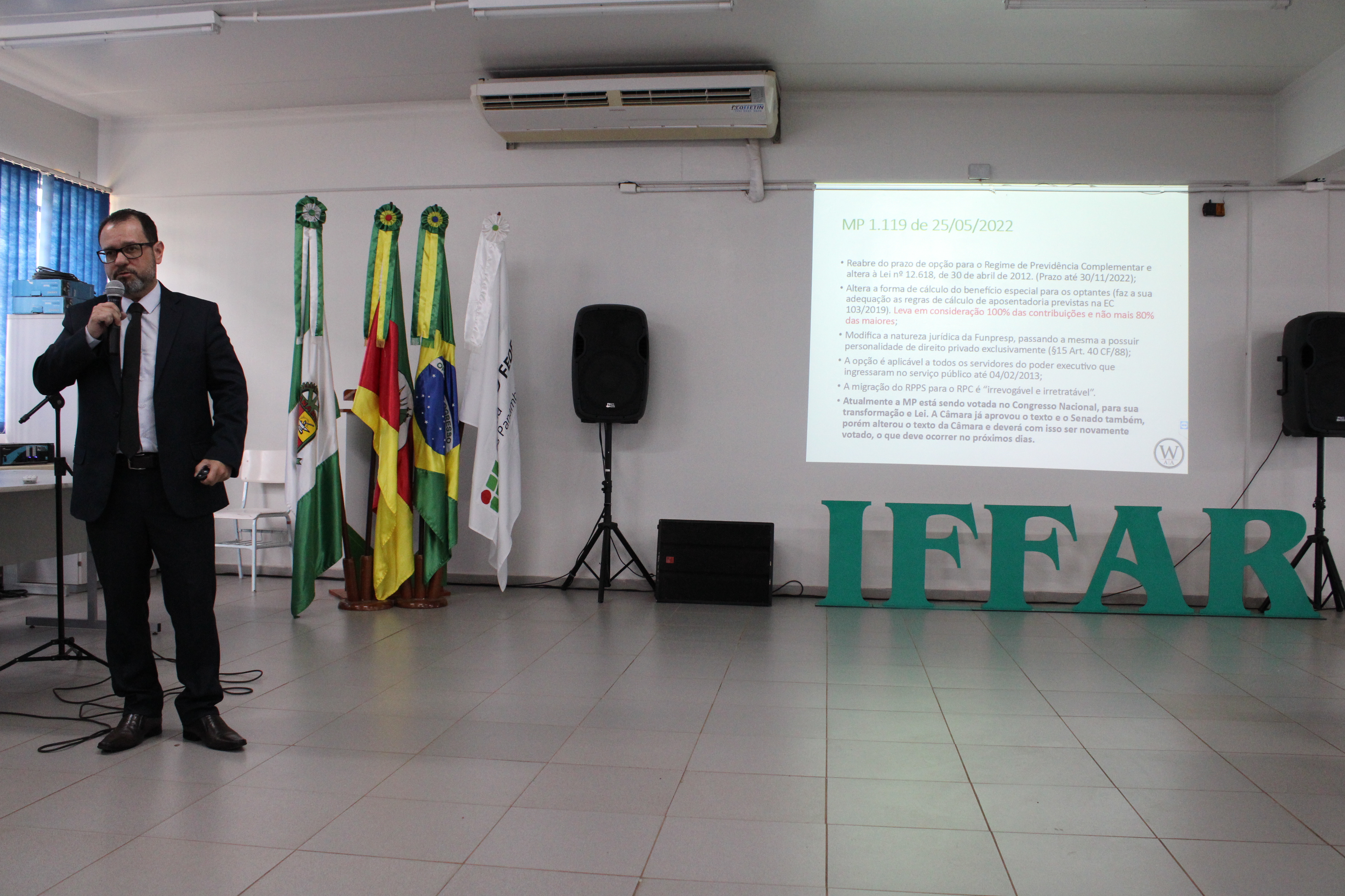 A palestra teve mediação do Sr. Jesner Nunes, servidor público lotado na Diretoria de Gestão de Pessoas da Reitoria do IFFar, vinculado ao Núcleo de Aposentadoria e Pensões.