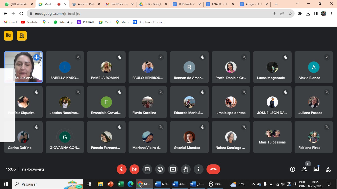 #PraTodosVerem Sequência de 5 fotos dos participantes do evento, sendo 4 delas das apresentações de trabalhos online e 1 delas com foto dos participantes do encontro presencial, todos em pé, em frente ao banner do evento.