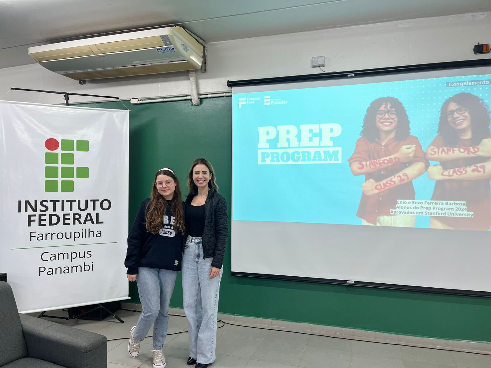 A aluna Júlia Meireles Noll, do 3º ano do Curso Técnico em Informática Integrado ao Ensino Médio, apresentou as oportunidades de bolsa de estudos do Prep Program, iniciativa da Fundação Estudar – ONG brasileira que apoia o desenvolvimento de jovens líderes por meio de bolsas de estudo, programas de capacitação e conteúdos voltados à carreira e à liderança. O Prep Program é um curso de um ano de duração que oferece mentoria personalizada e auxílio financeiro a estudantes interessados em realizar estudos no exterior, preparando-os para enfrentar processos seletivos internacionais e potencializando suas chances de sucesso.