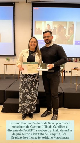 Um destaque especial vai para a discente Giovana Damian Barbará da Silva, que recebeu menção honrosa pela apresentação de seu trabalho, reconhecimento que demonstra a qualidade e a relevância das pesquisas desenvolvidas no âmbito do ProfEPT/IFFar.