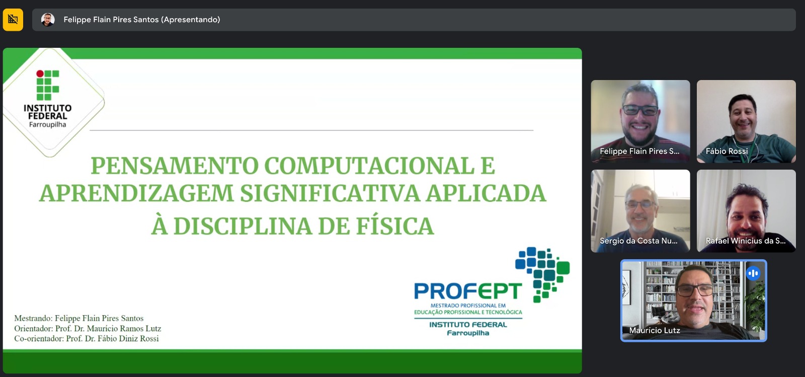 Dia 30/08 - qualificação do projeto de pesquisa intitulado “Pensamento Computacional e aprendizagem significativa aplicada à disciplina de Física”, de autoria do mestrando Felippe Flain Pires Santos, orientado pelo professor Dr. Mauricio Ramos Lutz e Coorientado pelo professor Dr. Fábio Rossi.