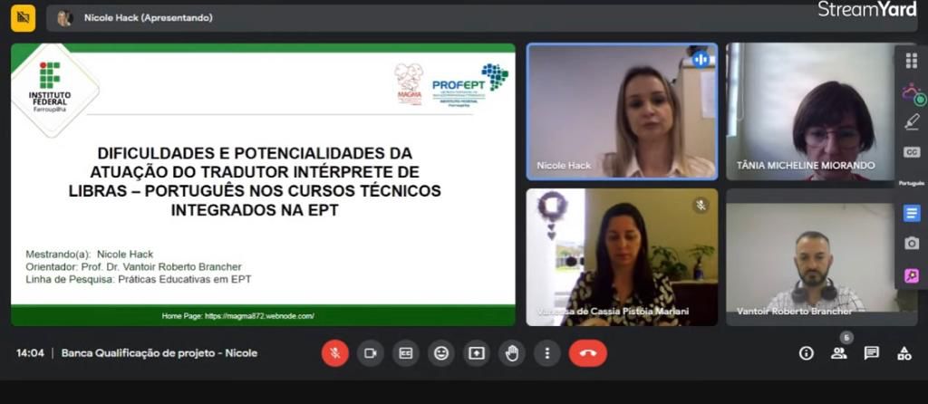 Dia 17/08 - qualificação do projeto de pesquisa intitulado “Dificuldades e potencialidades da atuação do tradutor intérprete de Libras - Português nos cursos técnicos integrados na EPT”, de autoria da mestranda Nicole Hack, orientada pelo professor Dr. Vantoir Roberto Brancher.