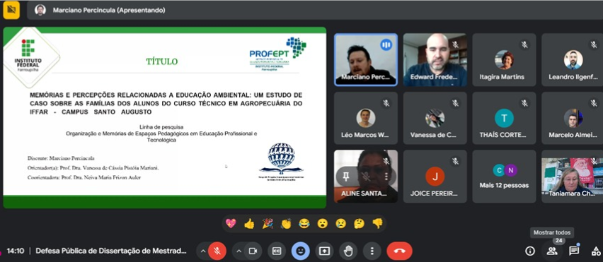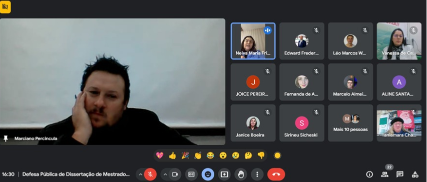 O trabalho foi defendido pelo agora egresso do curso Marciano Percincula, orientado pela professora Dra. Vanessa de Cássia Pistóia Mariani, e coorientado pela professora Dra. Neiva Mari Frisou Auler, na linha de pesquisa Organização e Memórias dos Espaços Pedagógicos da Educação Profissional e Tecnológica.