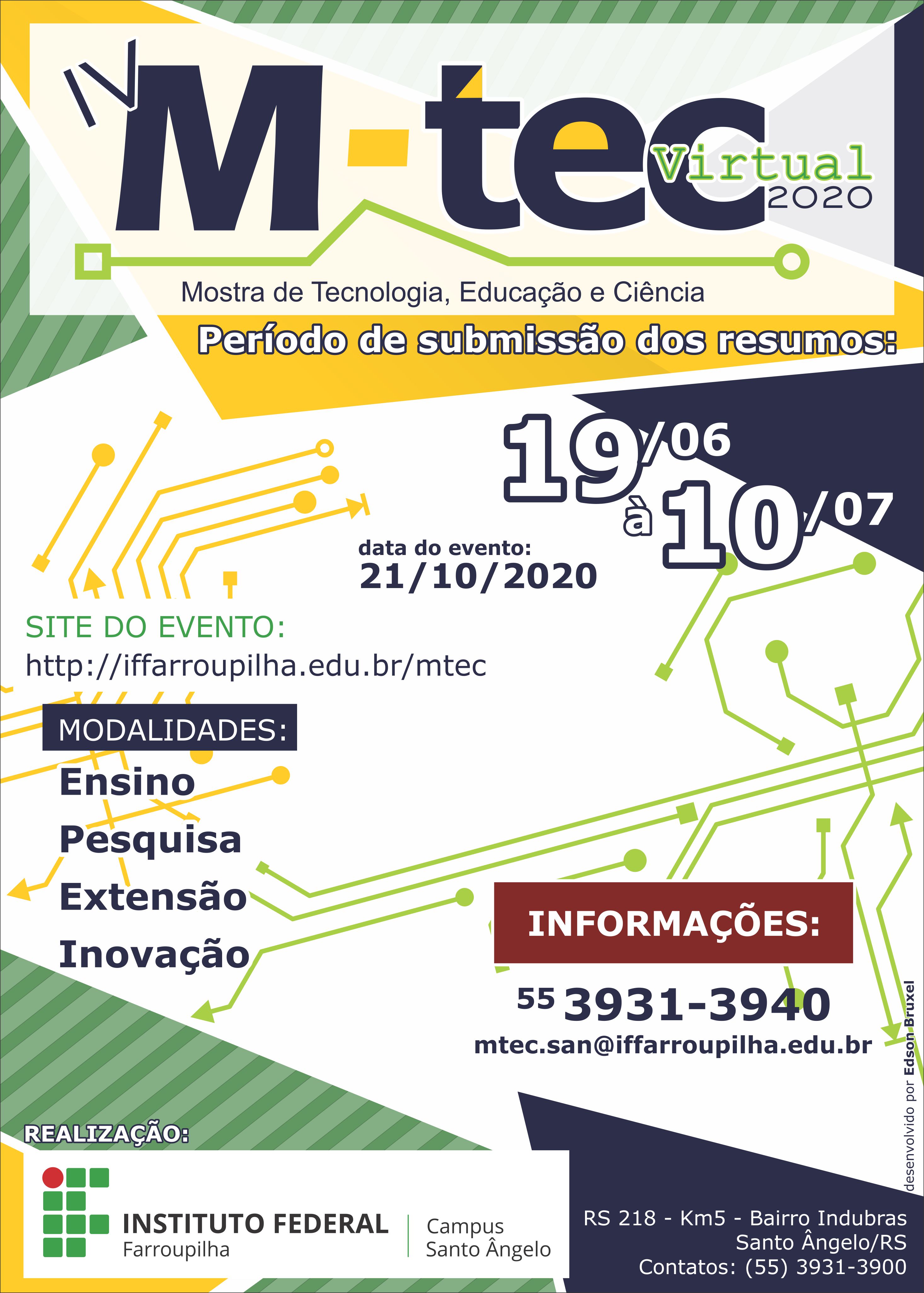 A Comissão Organizadora da IV M-TEC do IFFar Campus Santo Ângelo comunica que está aberto o período de submissão de resumos para o evento 2020, que deverá ocorrer em formato digital.