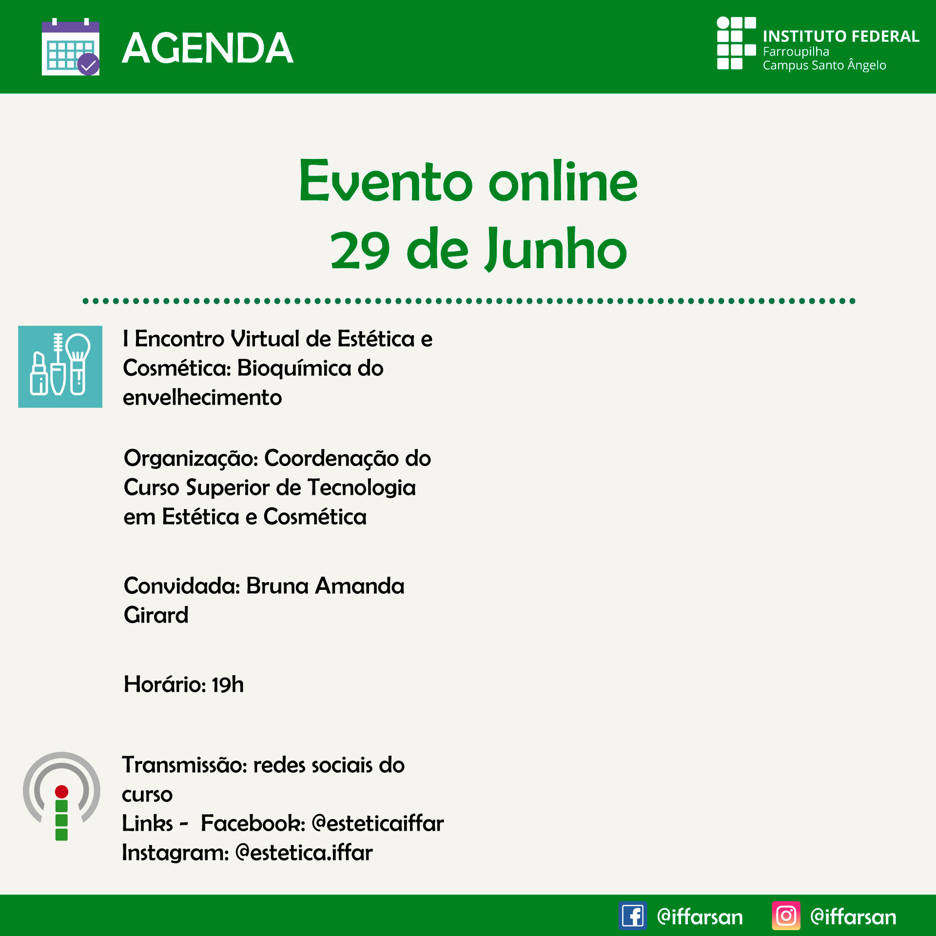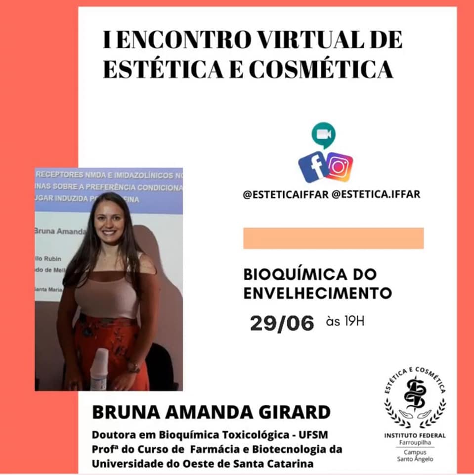 Nesta 6ª e última semana, teremos a palestra "Bioquímica do envelhecimento", através do encerramento do I Encontro Virtual de Estética e Cosmética promovido pelo Curso Superior de Tecnologia em Estética e Cosmética.