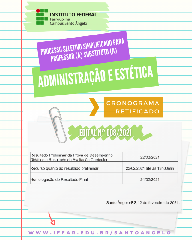 O IFFar Campus Santo Ângelo publicou na tarde desta sexta-feira (12) o Edital nº 008/2021, que altera as datas de divulgação dos resultados cronograma do Processo Seletivo Simplificado para Contratação de Professor(a) Substituto(a) nas áreas de Administração e Estética. Para saber mais, clique aqui.