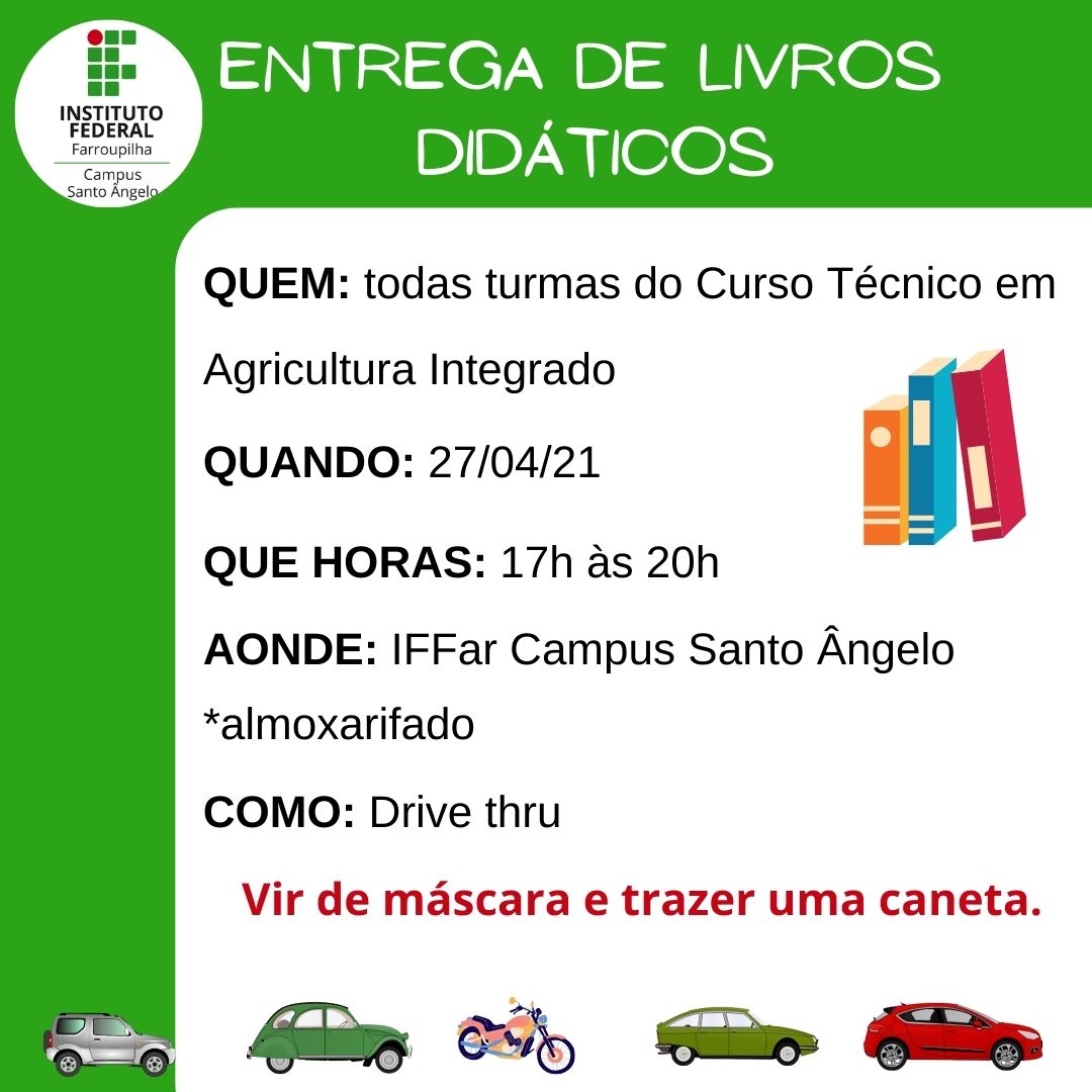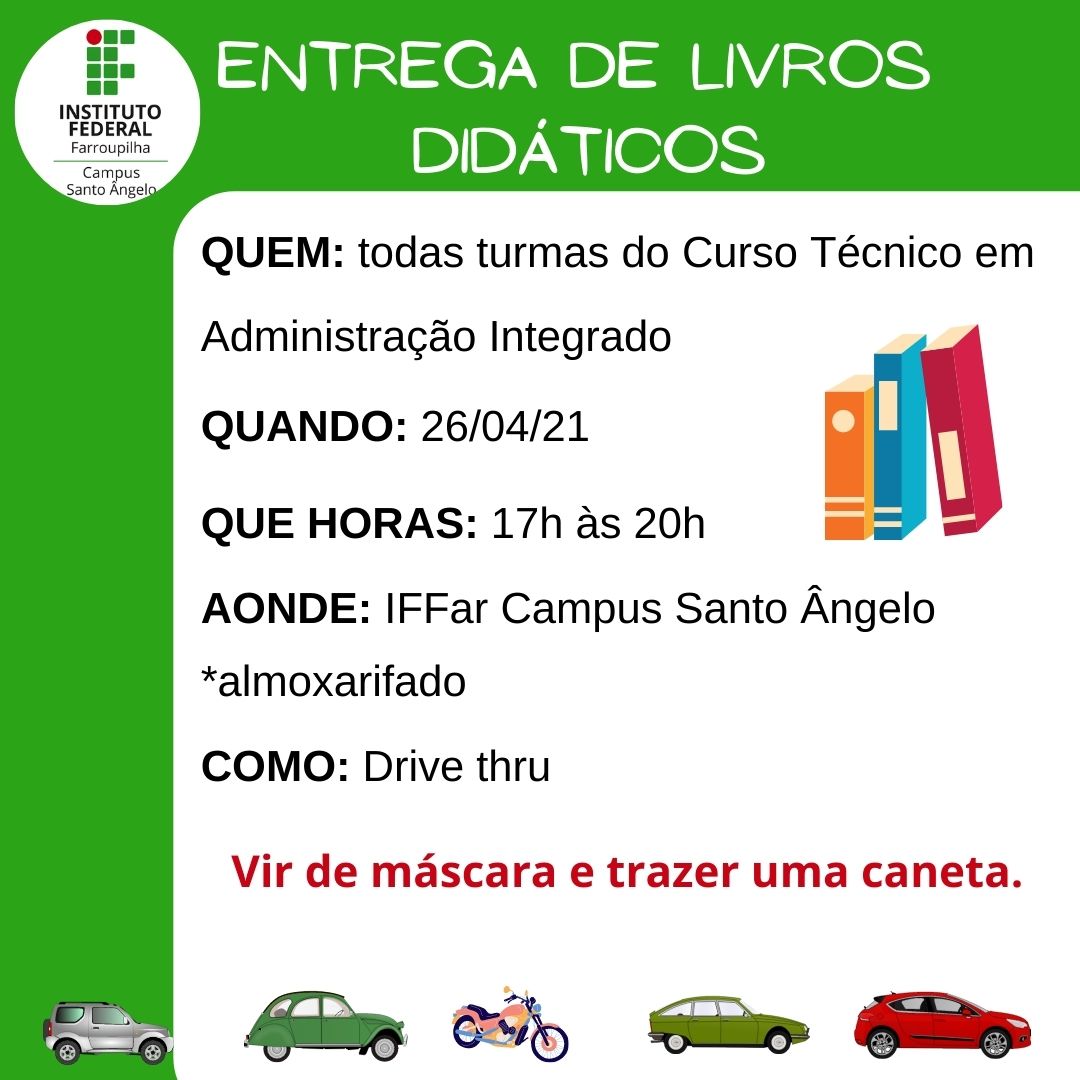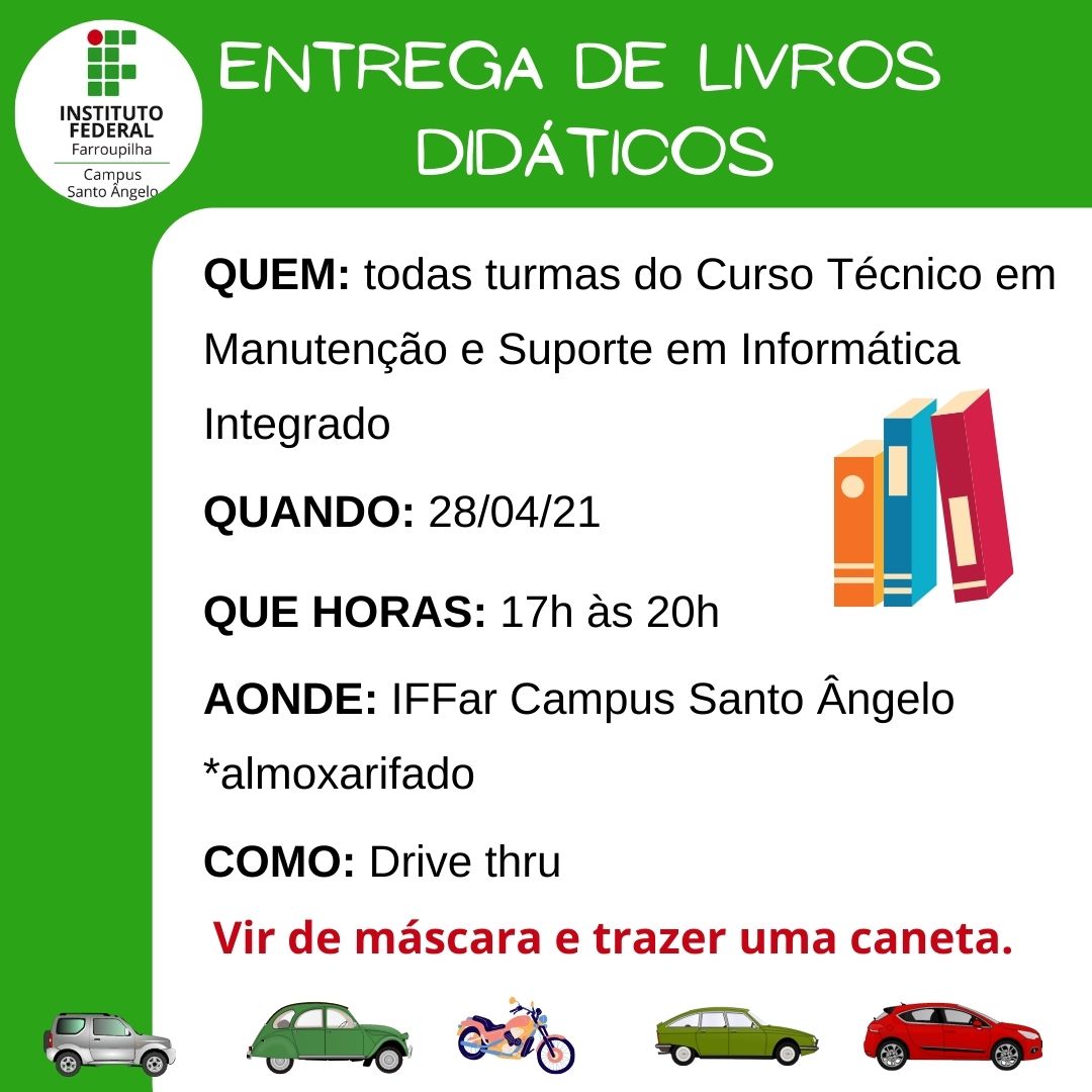 Na semana que vem, entre os dias 26, 27 e 28/04 realizaremos a entrega dos Livros Didáticos aos estudantes do ensino médio integrado.