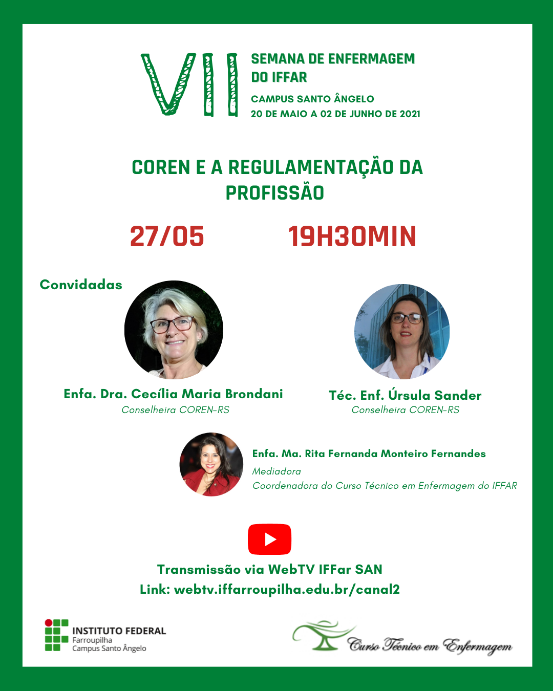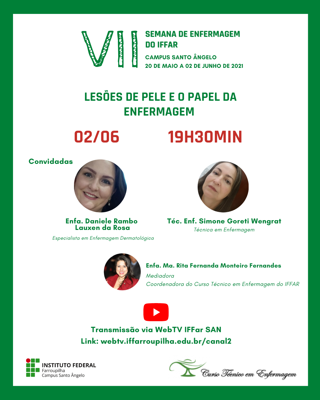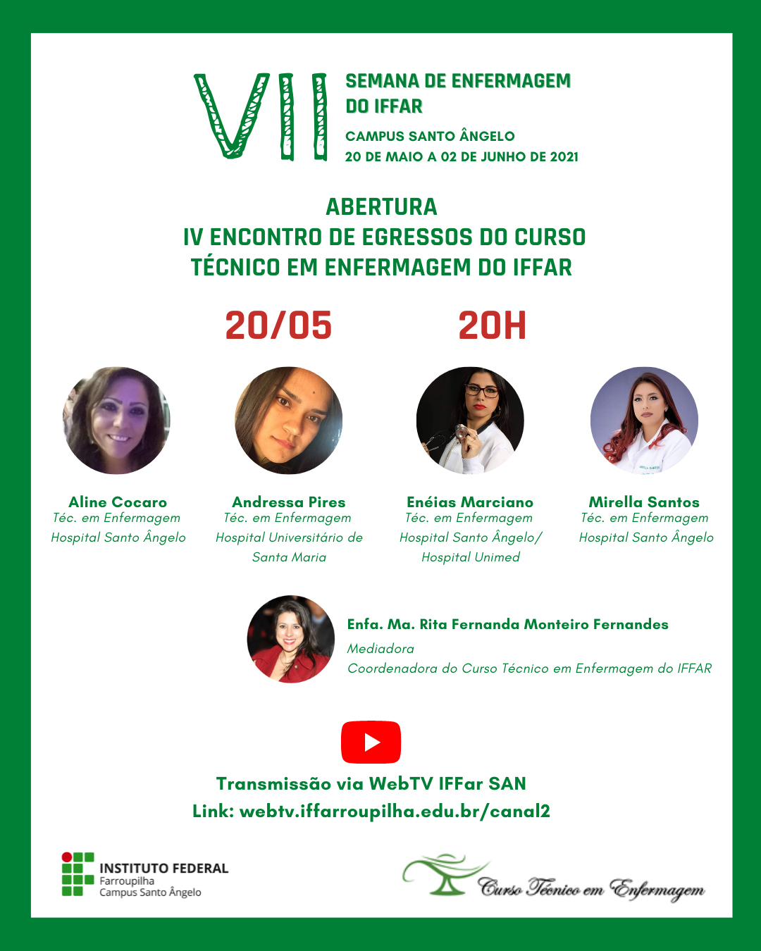 A VII Semana de Enfermagem do IFFAR, a ser realizada dos dias 20 de maio a 02 de junho de 2021, foi pensada com o intuito de proporcionar um importante momento de reflexão e aprendizado sobre o cuidado ao ser humano.